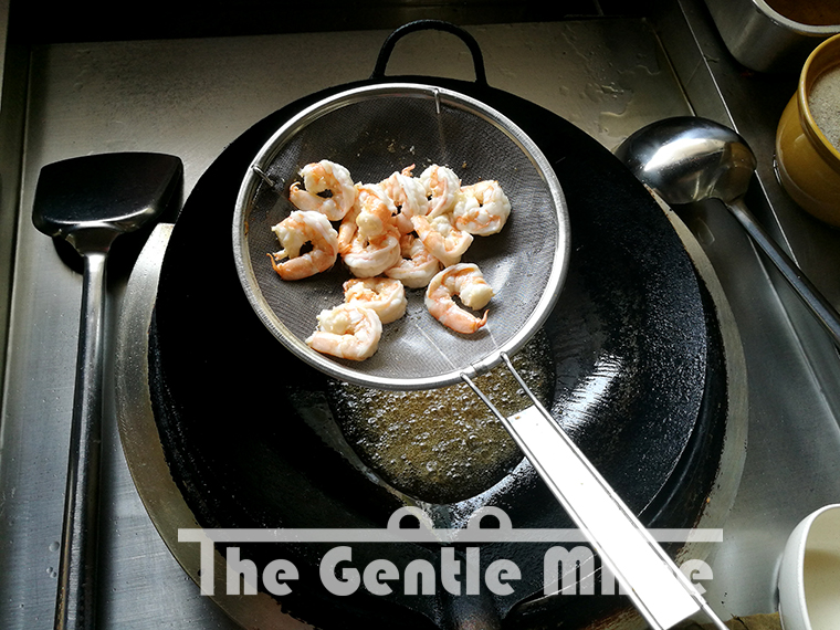 ฉ่ากุ้งด้วยน้ำมันร้อนๆ เพื่อให้กุ้งกรอบเด้งเต่งตึง (ไม่ต้องทอดนานนะครับ กุ้งสุกง่ายอยุ่แล้ว)
