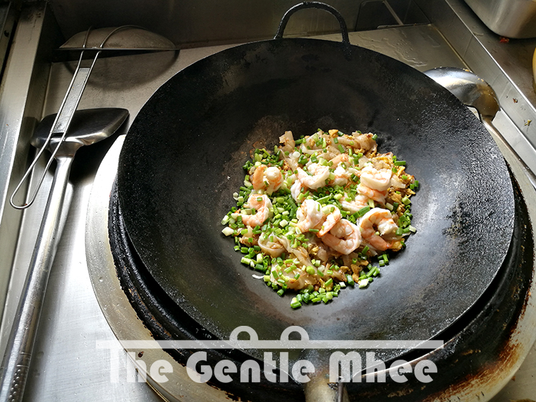 เมื่อผัดจนแห้งเป็นที่ถูกใจแล้ว ก็ใส่กุ้งและต้นหอมซอยลงไป เร่งไฟแรงแล้วผัดเร็วๆอีกซักที