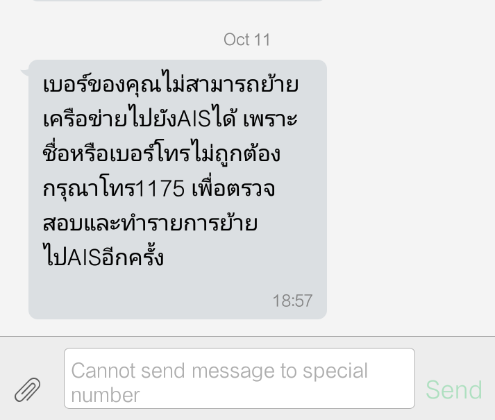 ผมได้ทำการขอข้อความยืนยันการย้ายค่ายเบอร์เดิม จาก TrueMove H ไป AIS แต่ได้รับข้อความตอบกลับดังภาพด้านล่าง ผมสงสัยตรงที่หมายเลขโทรศัพท์นี้เป็นบริการแบบ "เติมเงิน" แล้วผมมียอดค้างชำระได้