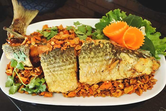 "ปลากระบอกทอดขมิ้น" ปลาตัวใหญ่ดี เนื้อเยอะ กรอบด้วย ปลาไม่คาวจ้า และโรยด้วยขมิ้นกับกระเทียม