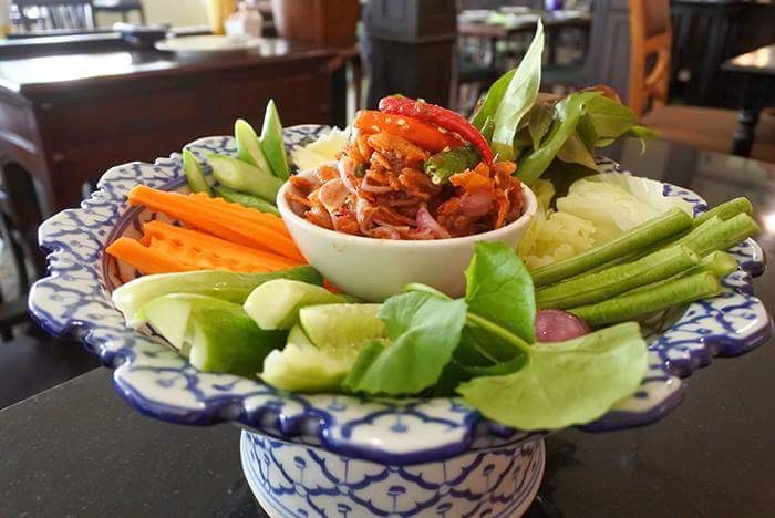 "น้ำพริกกุ้งเสียบ" รสชาติเผ็ดอยู่ เคียงด้วยผักสด เป็นเมนูเด็ดประจำร้านเลยจ้า