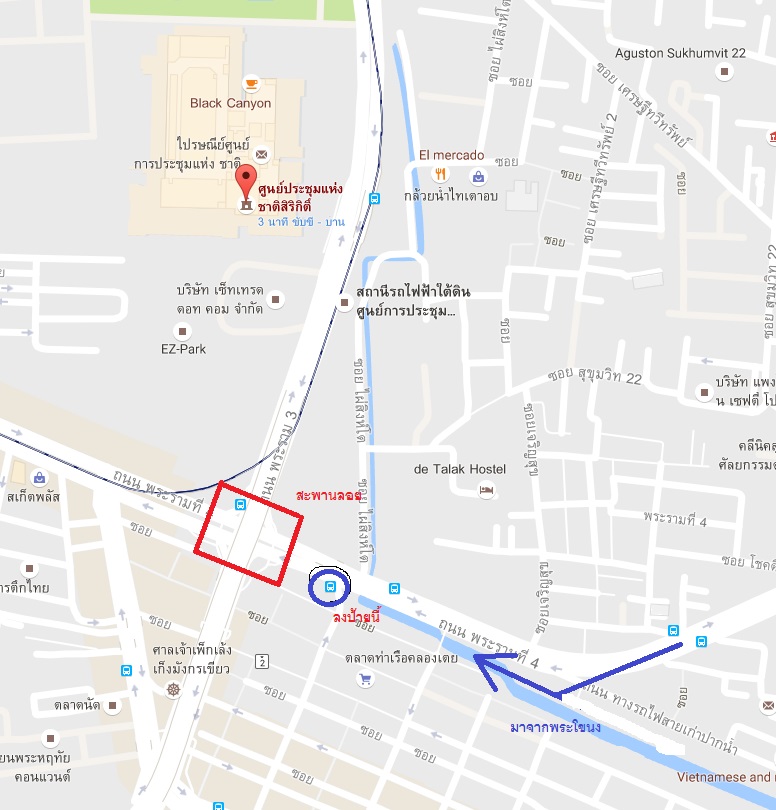ถ้าเลยไปลง ป้ายการไฟฟ้าคลองเตย ข้ามสะพานลอย ไปเข้า ส่วนของ ยาสูบ เดินไกลกว่าร้อน และเข้าด้านหลังศูนย์การประชุม