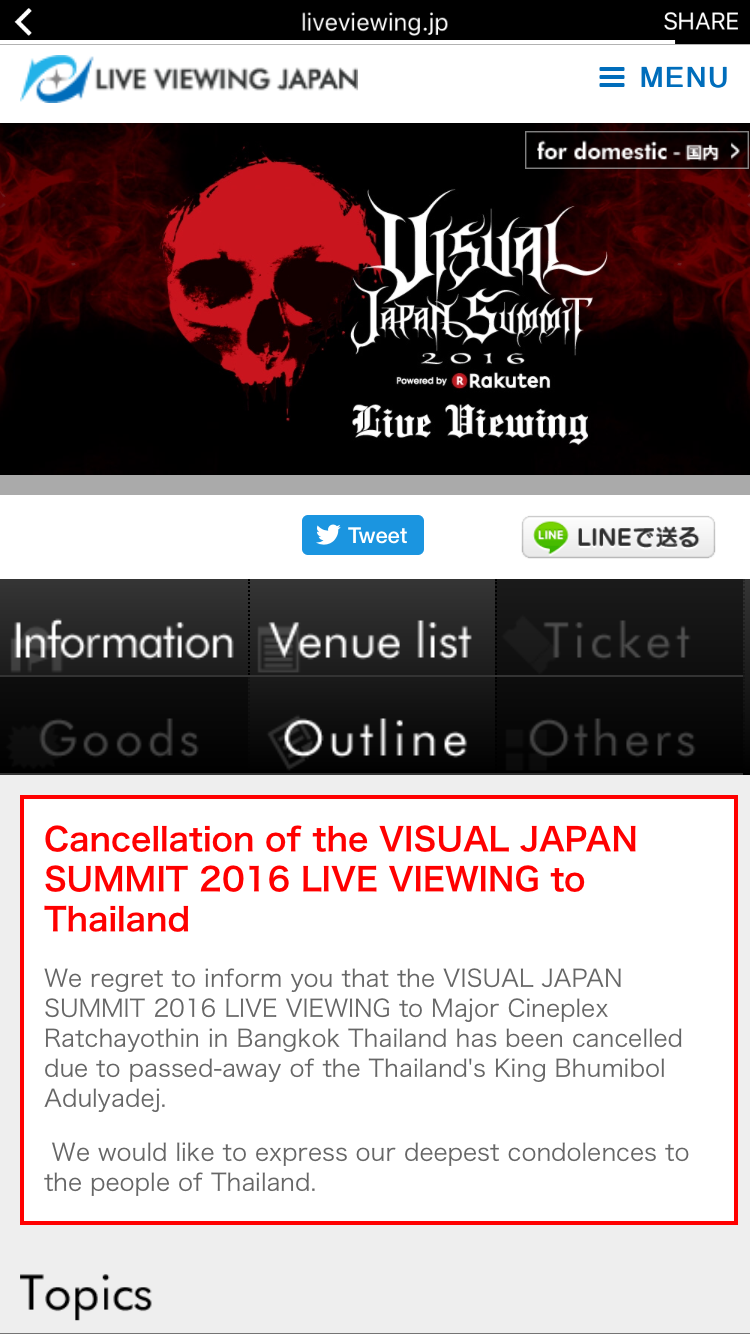 อันนีมีประกาศเป็น ว่าจะมีการถ่ายทอดสดงาน Visual Japan Summit 2016 มาที่ไทยด้วย โดยตอนนี้เหมือนจะมีการถ่ายทอดเป็นระยะเวลา 4 ชั่วโมงในช่วงวันที่ 16 ตุลาคม นี้ เครดิตข่าว http://liveviewing.jp/screenin