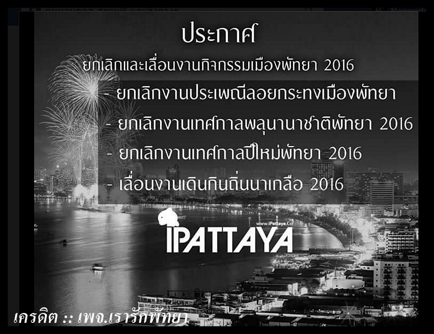 ::::: เมืองพัทยาประกาศยกเลิกกิจกรรมปี 2016 :: งานพลุ , งานลอยกระทง และ งานปีใหม่ ::::::