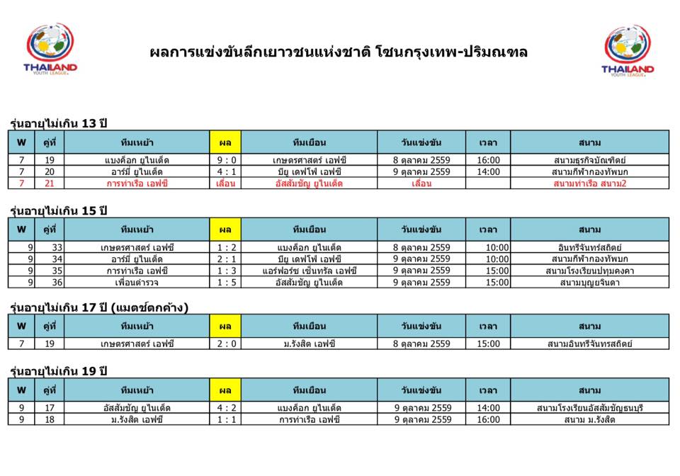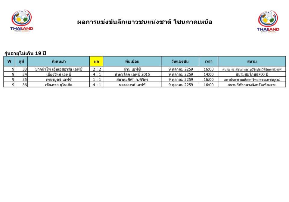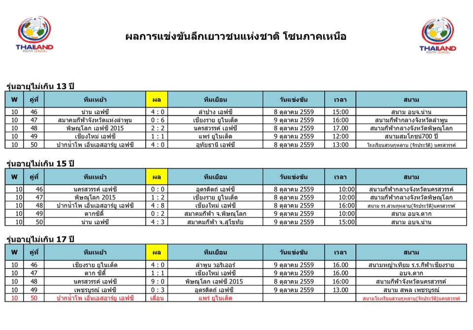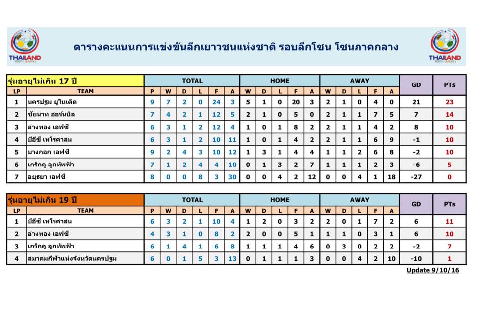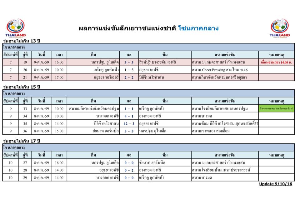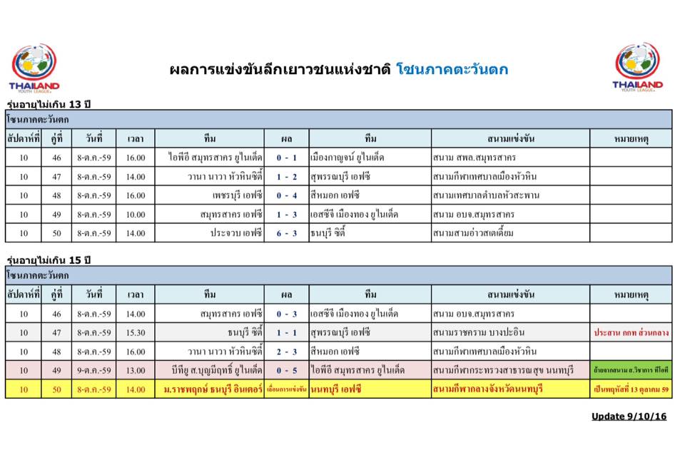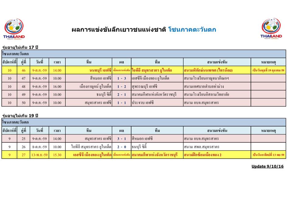 อัพเดตข่าวเกี่ยวกับฟุตบอลลีกเยาวชนแห่งชาติ 15 ตุลาคม 2559