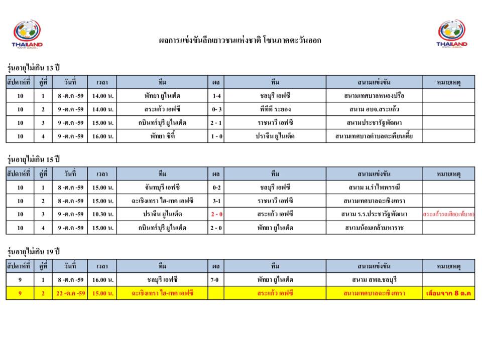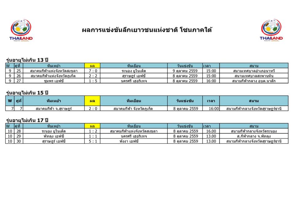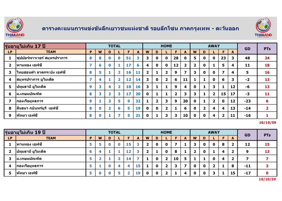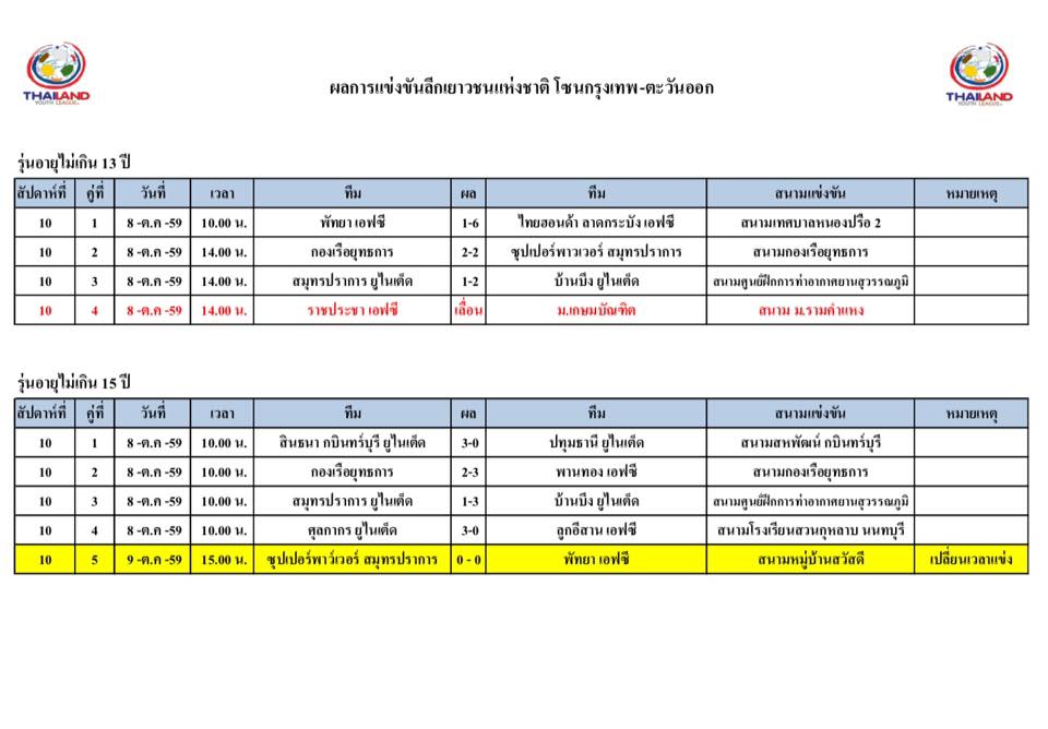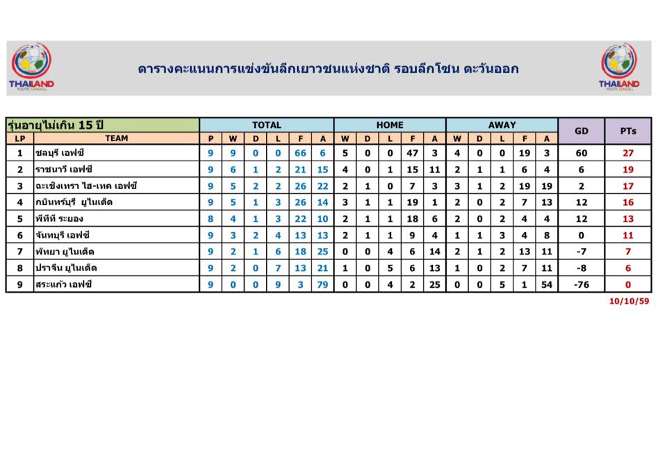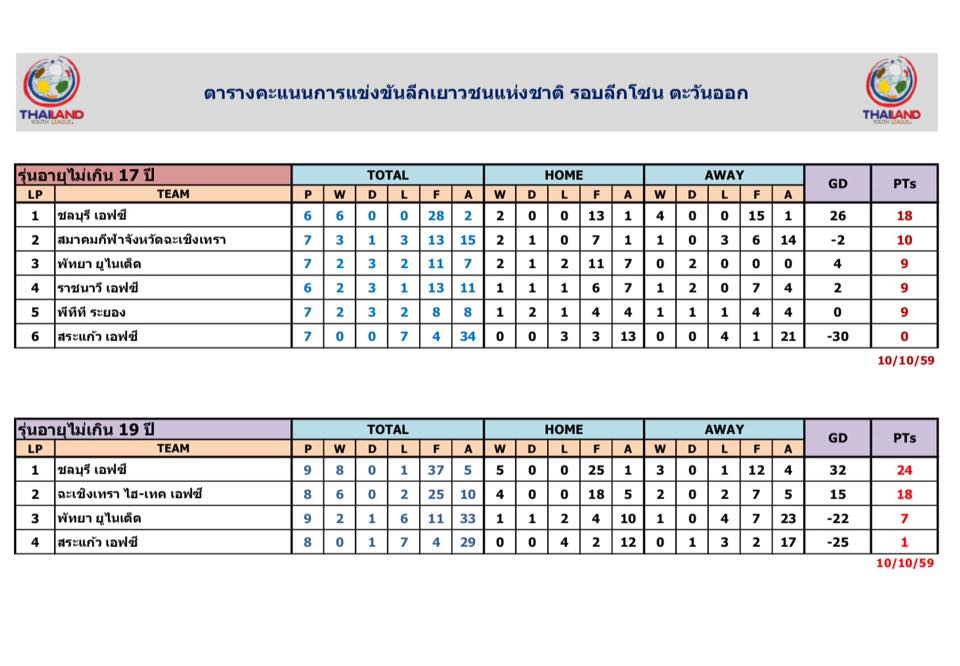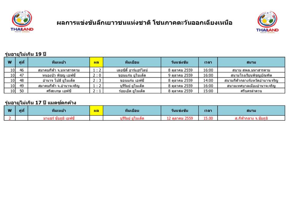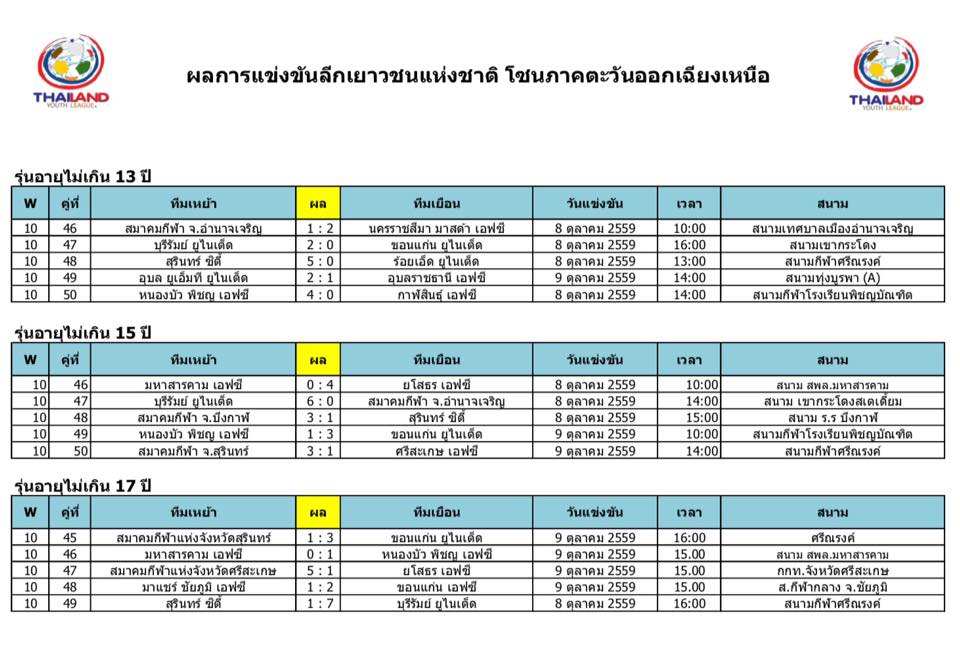อัพเดตข่าวเกี่ยวกับฟุตบอลลีกเยาวชนแห่งชาติ 15 ตุลาคม 2559