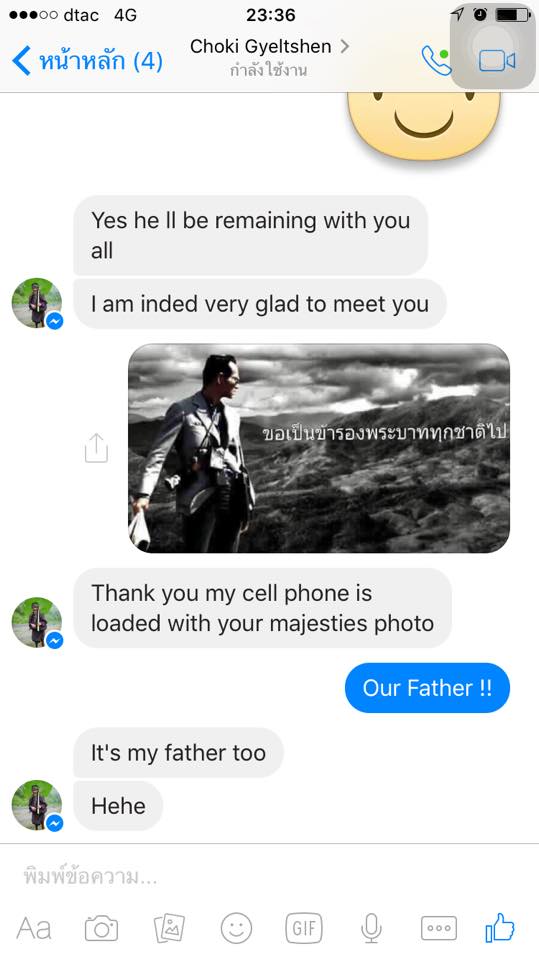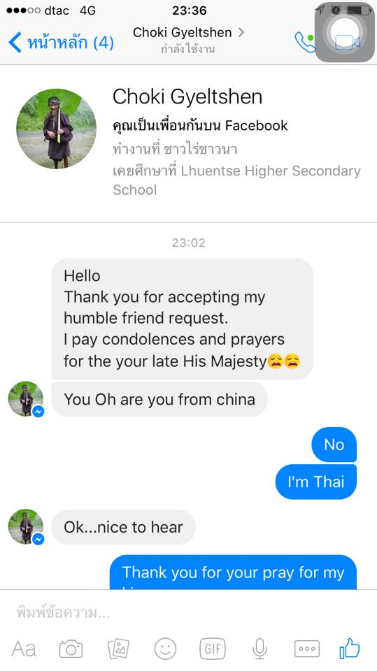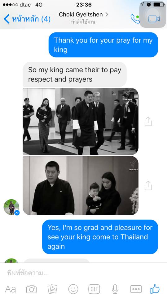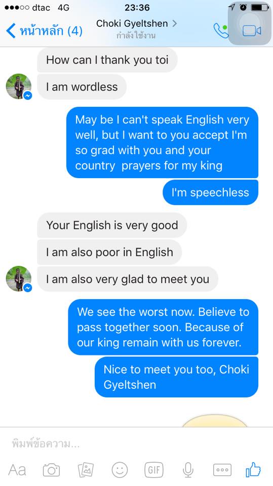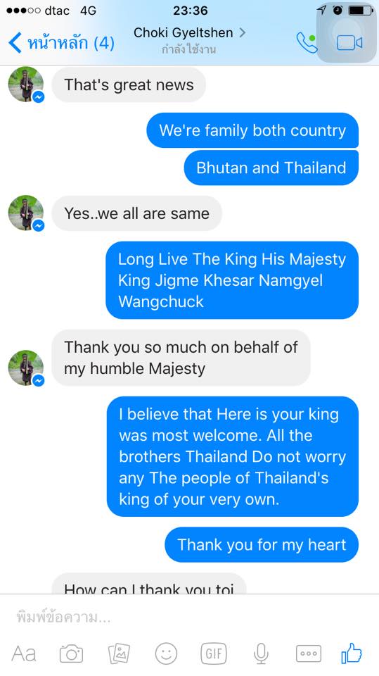 คือ ประโยคแรกที่ขึ้นต้น น้ำตาผมมันค่อยๆไหลออกมา โดยที่ไม่รู้จะขอบคุณ รู้สึกตื้นตัน หรือรู้สึกเศร้าใจอย่างไร แต่มันคงเป็นความปลื้มปิติแทนพระเจ้าอยู่หัวของคนไทย ที่พสกนิกรชาวภูฏาน (Bhutanese) ยังรักและเคารพพระองค์ท่านเสมอ เหมือนเราคือครอบครัวเดียวกัน ให้กำลังใจซึ่งกันและกันเมื่อยามทุกข์ยากลำบากใจ คือ มันดีต่อใจในยามที่รู้สึกแย่ๆเป็นอย่างมากครับ