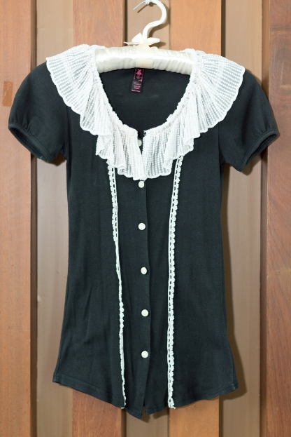 A076 เสื้อสีดำคอระบาย อก 32” ยาว 25” ราคา 50 บาท