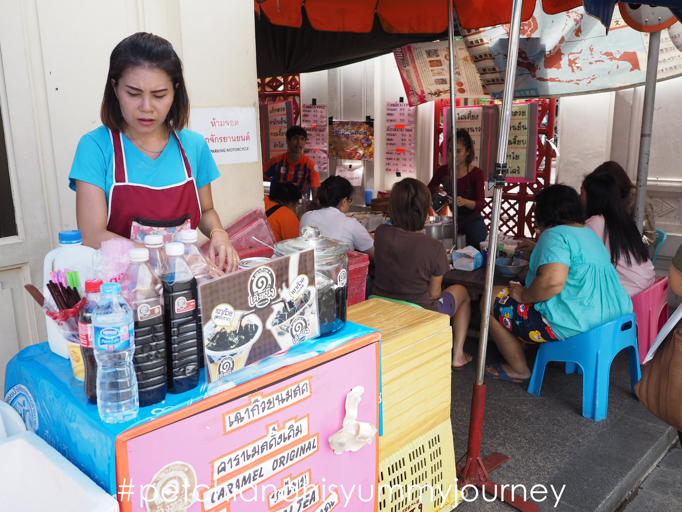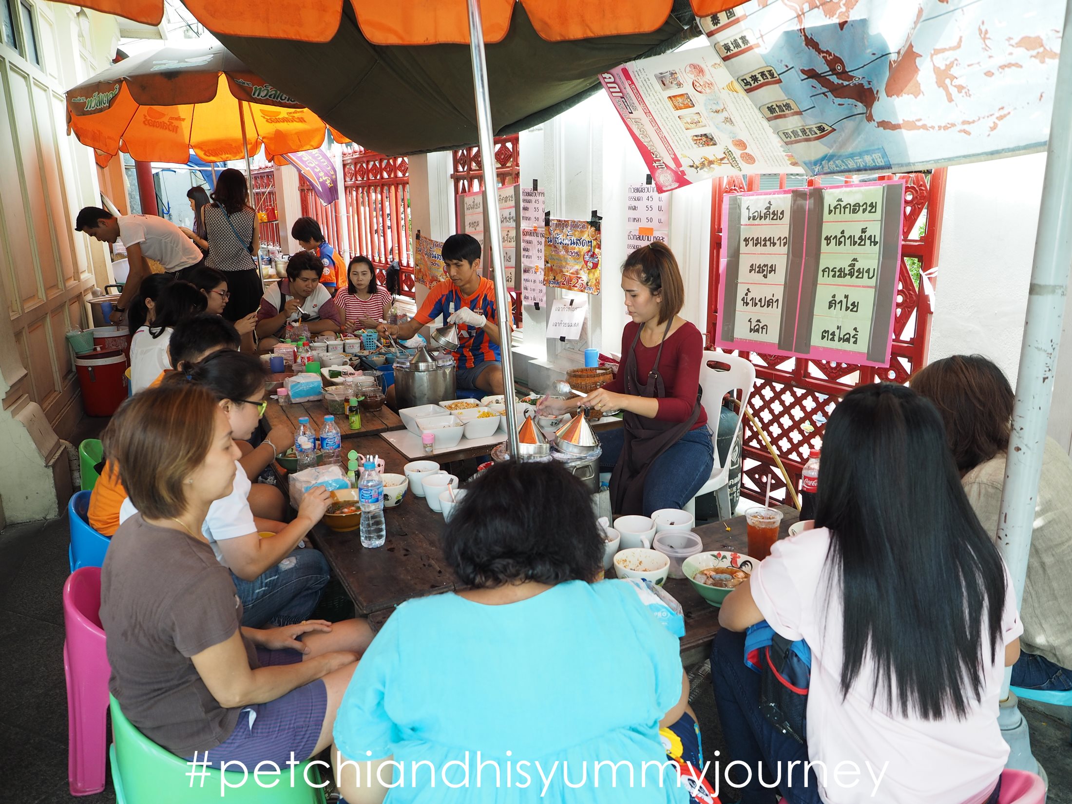 เมื่อหันไปมองออกนอกร้าน ผู้คนแน่นขนัดเข้าคิวอย่างเป็นระเบียบ ทั้งขาประจำที่แวะเวียนมาทุกอาทิตย์เพราะติดใจในรสชาติ และขาจรที่แวะเวียนมาไหว้สักการบูชาพระพุทธรูปทองคำที่วัดไตรมิตรแห่งนี้