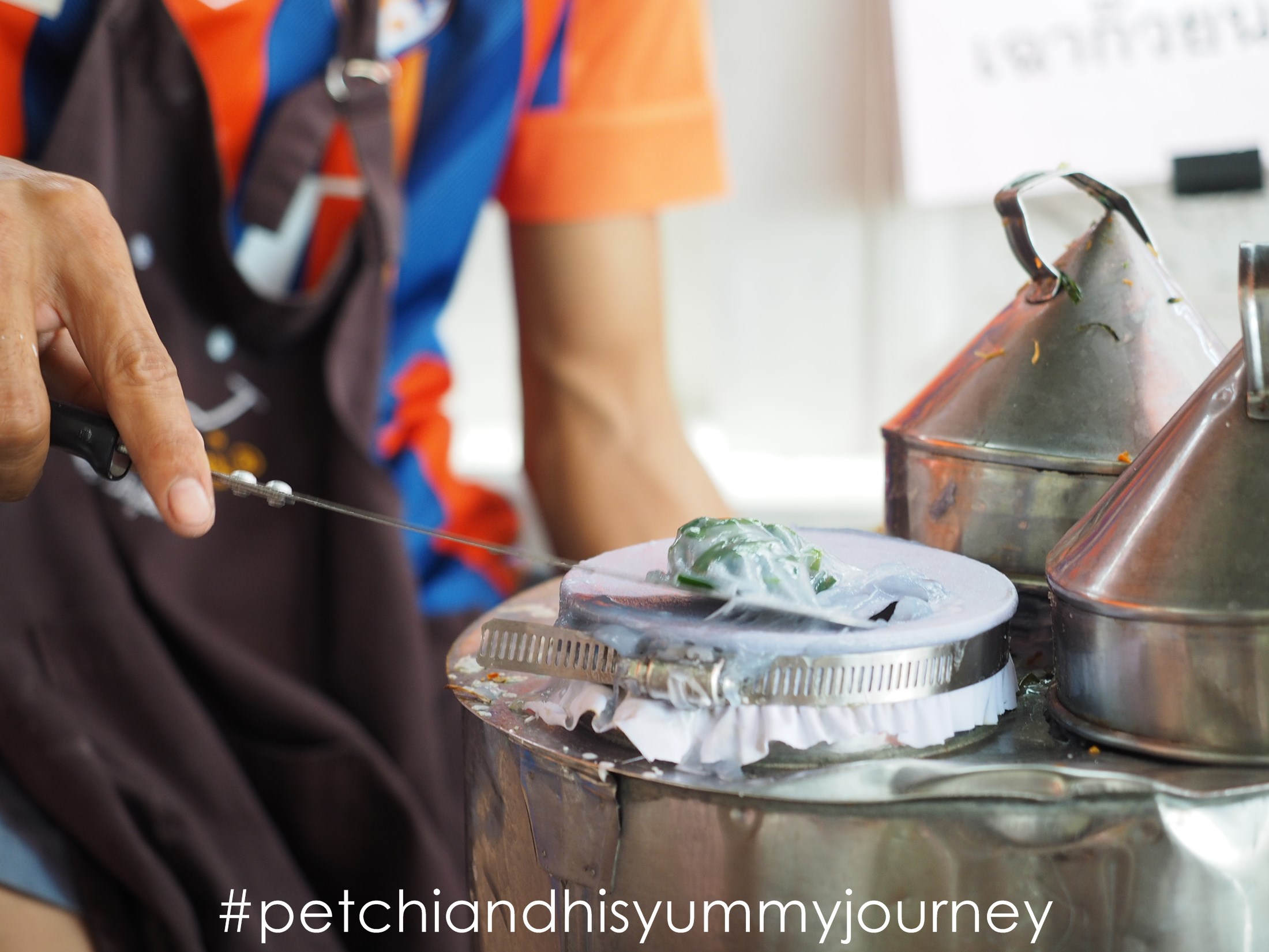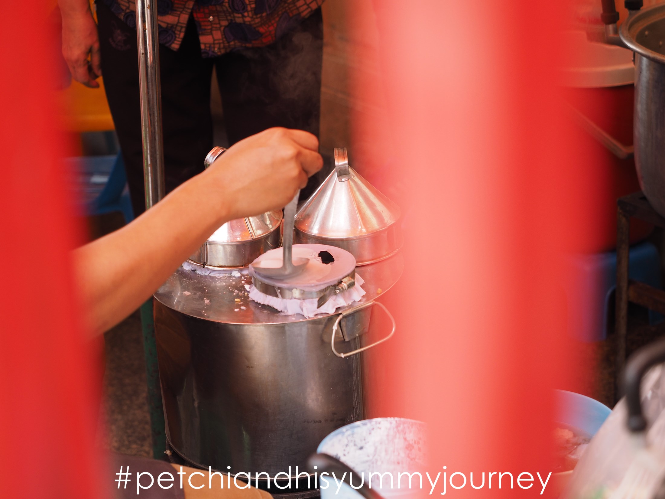 พี่ชายเสื้อส้มผมตรงหน้าผมบรรจงทำปากหม้อแต่ละตัว ละเลงแป้งเป็นแผ่นใหญ่บนหม้อน้ำร้อนที่มีผ้าขาวบางขึงปิดอยู่ และปิดกรวยเพื่อให้แป้งสุก จากนั้นจึงใส่ไส้ตามที่ได้สั่งไว้ สลับไปสลับมาอย่างชำนาญ ไม่แสดงความเบื่อหน่ายหรือเหน็ดเหนื่อยใดๆ ดูมีความสุขสนุกเสียด้วยซ้ำ จากนั้นก็ใช้ไม้พายส่งปากหม้อแต่ละตัวใส่ในชามของผมจนเต็ม
