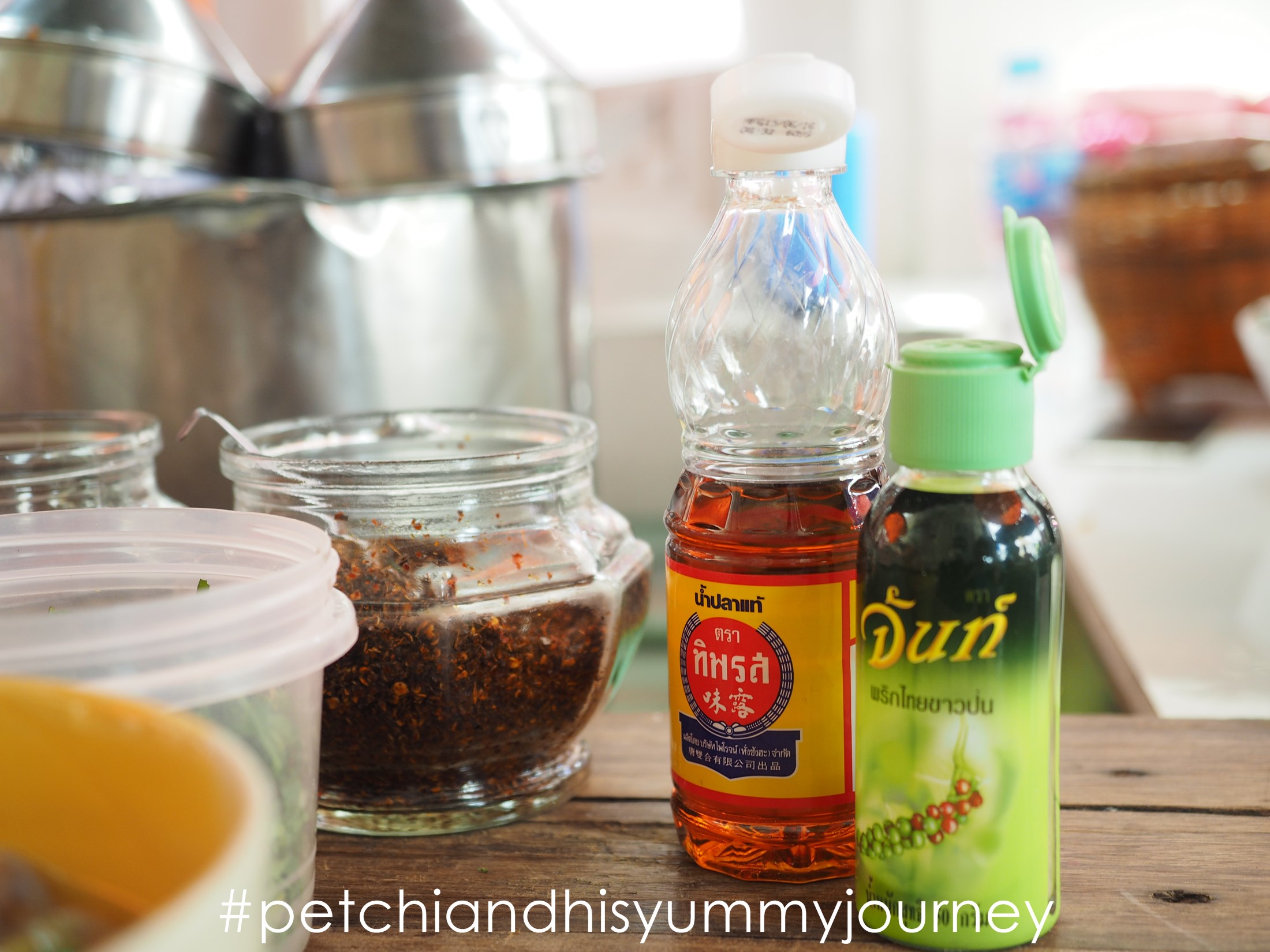 ที่เบื้องหน้าผมก็จะมีเครื่องปรุงแต่งรสชาติให้พอเหมาะพอเจาะตามแต่ละความชอบของบุคคล พริก น้ำส้ม น้ำตาล น้ำปลา พริกไทยป่น กระเทียมเจียวกากหมู และผักชีฝรั่ง