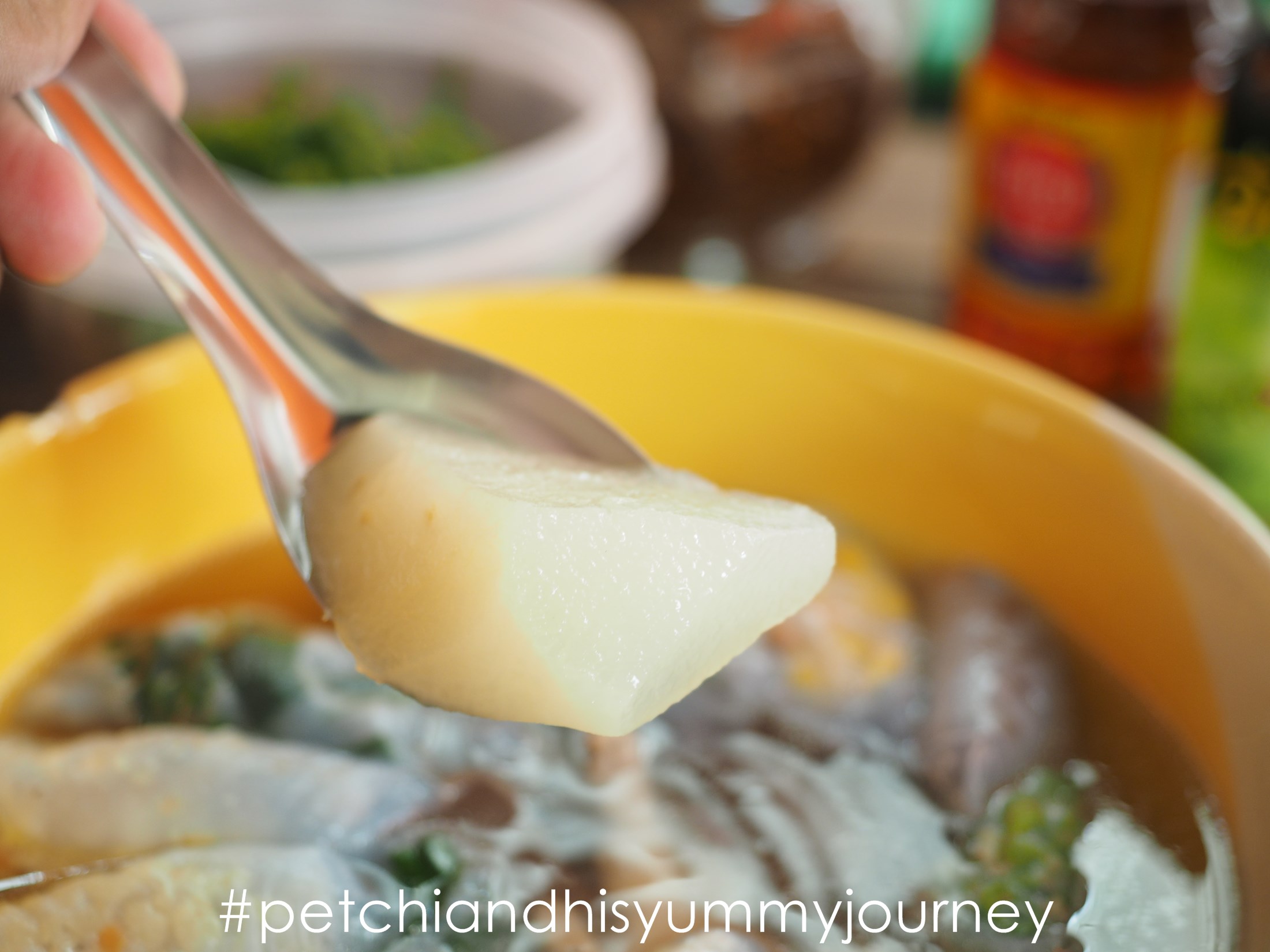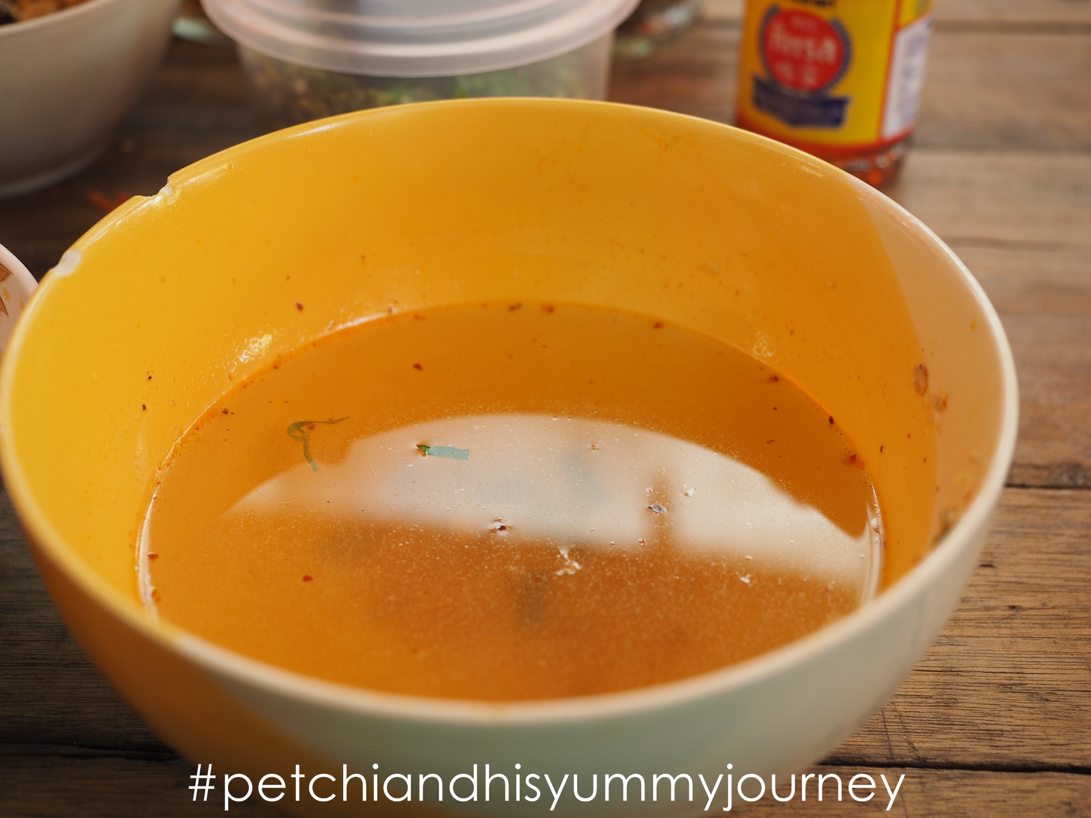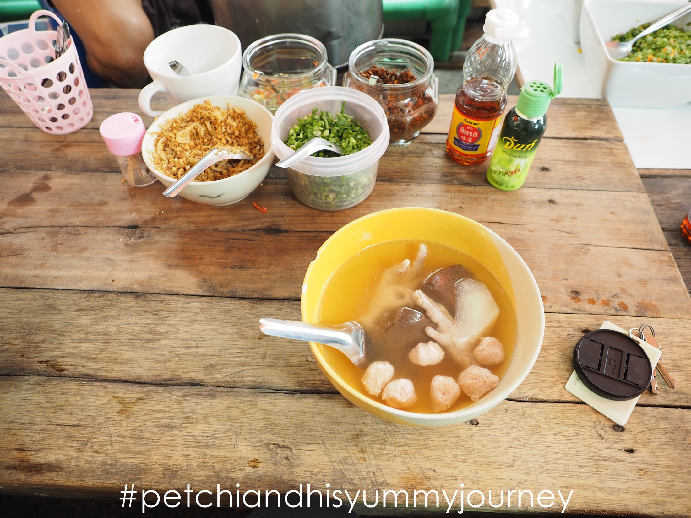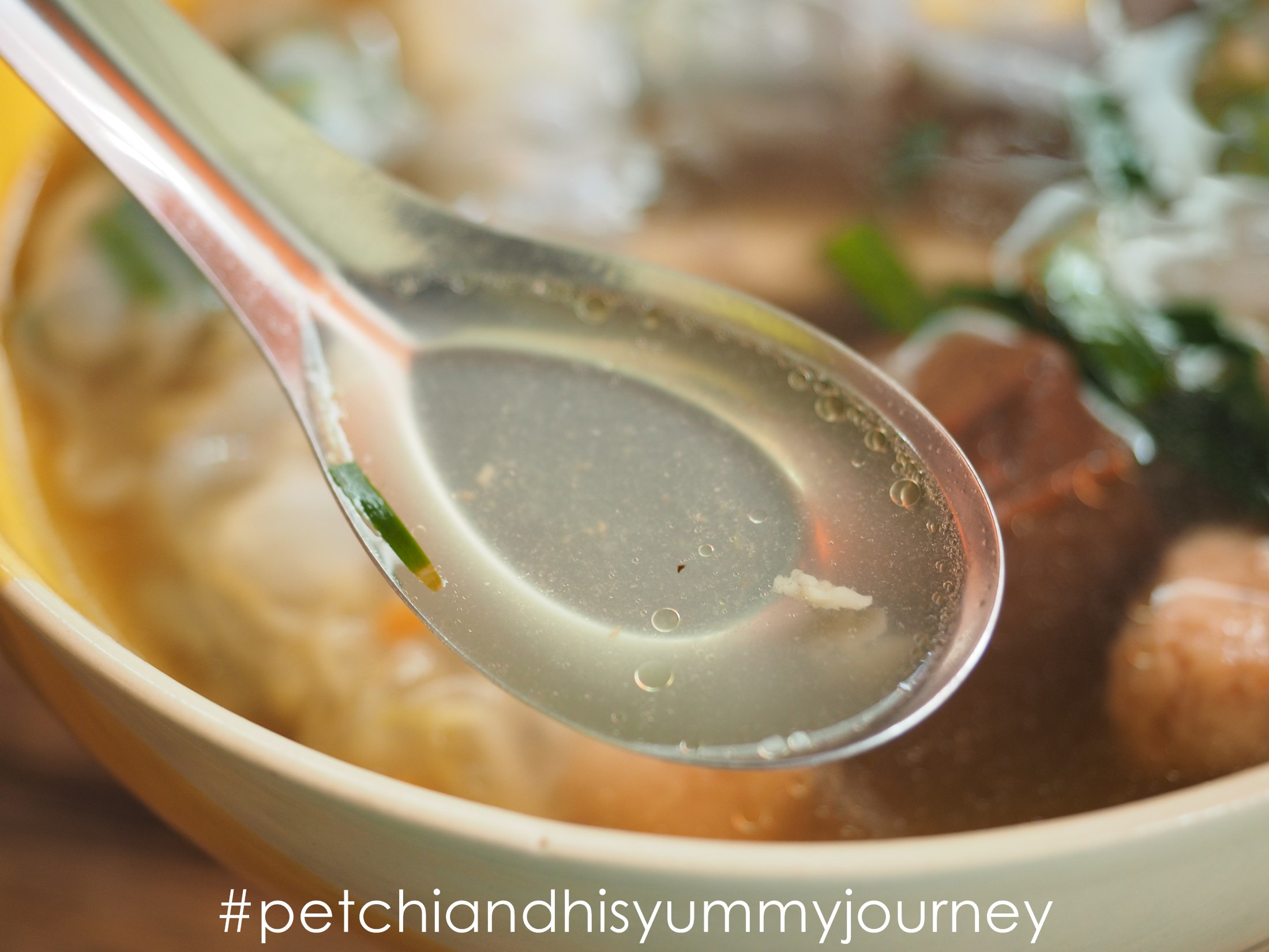น้ำซุป ใส กลมกล่อม มีฟักช่วยชูรสความหวาน รสชาติคงที่ทุกครั้งที่มา หากเป็นคนชอบรสจืดๆ ก็คงไม่จำเป็นต้องปรุงรสใดๆอีกแล้ว สมบูรณ์ในตัวมันเอง อีกทั้งไม่ทิ้งความกระหายน้ำหลังจากกินเสร็จ ซดน้ำซุปร้อนๆประกอบกับบรรยากาศอบอ้าวภายใต้ผ้าใบที่มุงบังแสงอาทิตย์อยู่นี้ ทำให้มีจุดน้ำเล็กๆค่อยๆซึมทั่วแผ่นหลังของผม จนเห็นได้จากภายนอกเสื้อผ้า