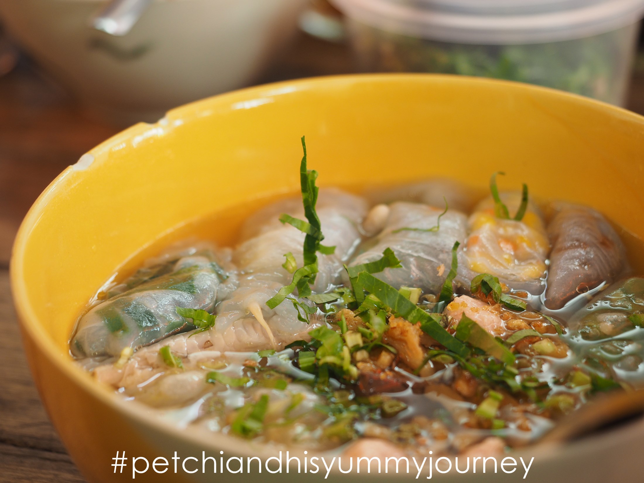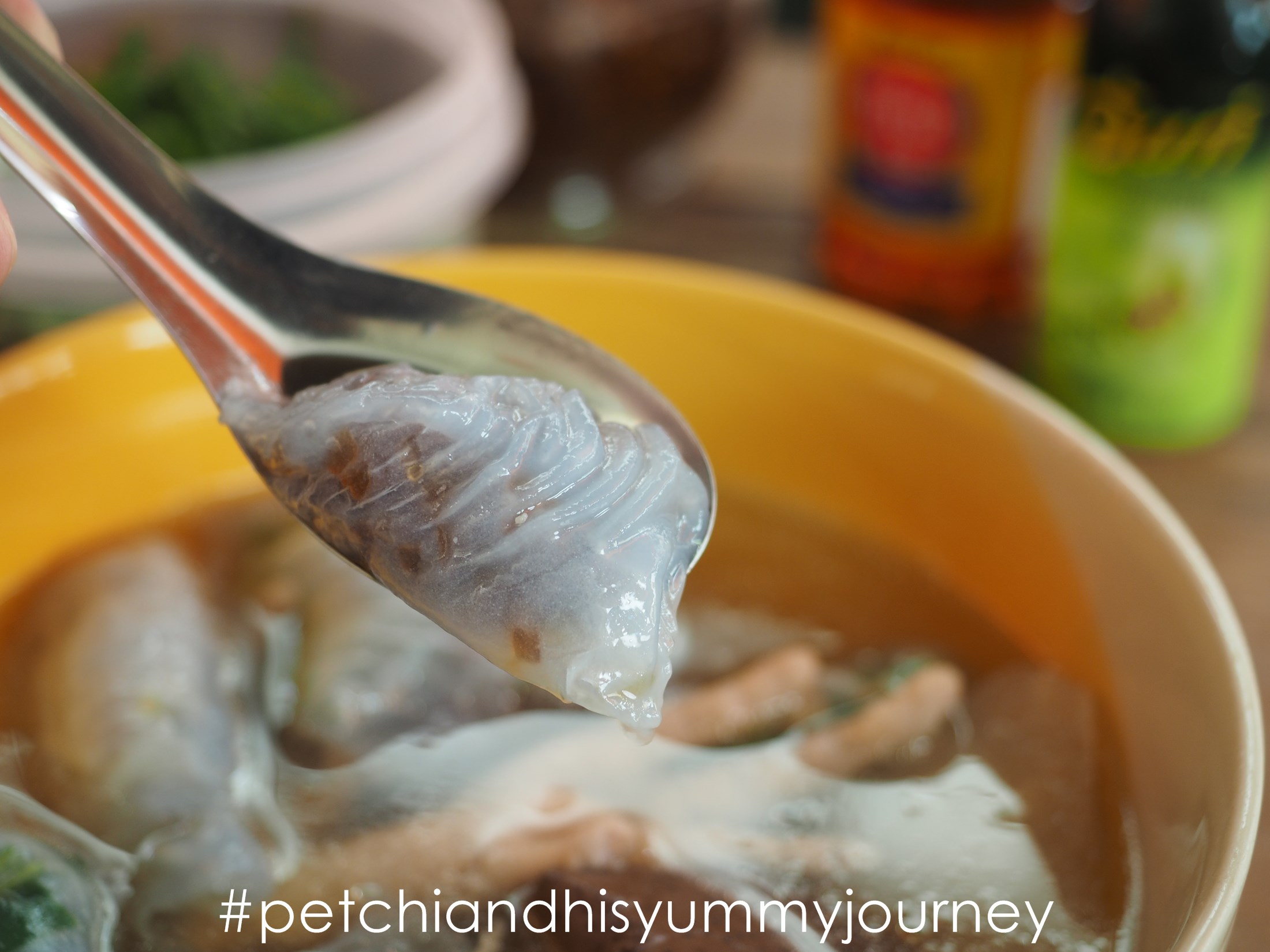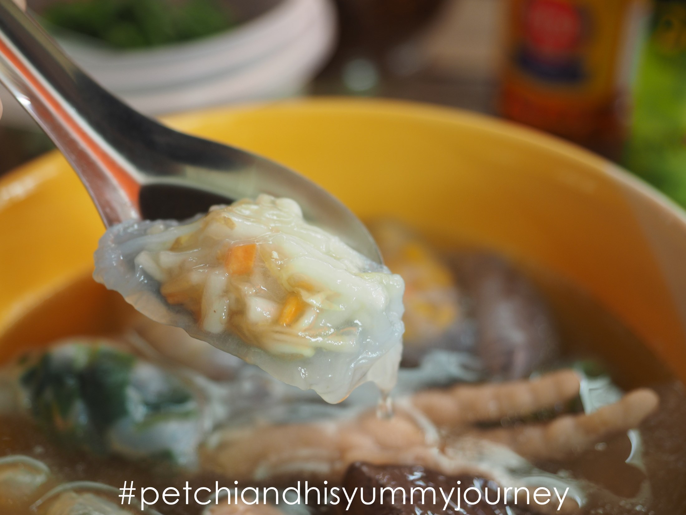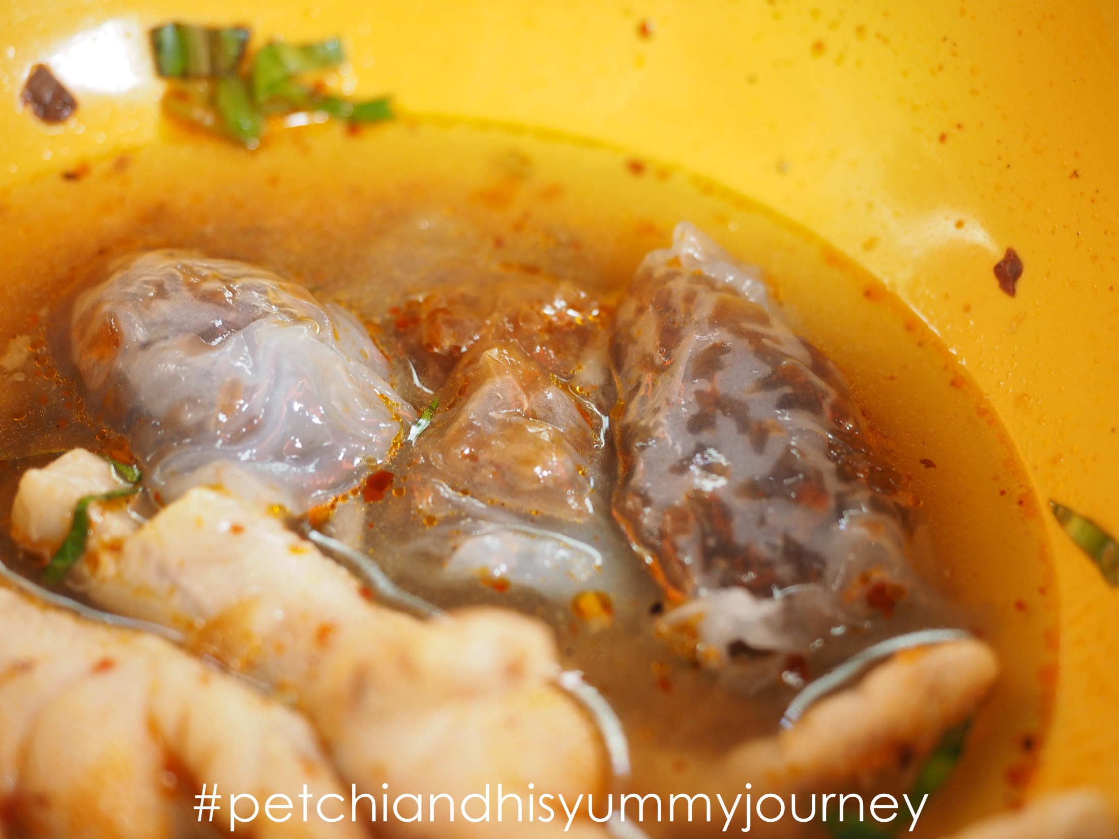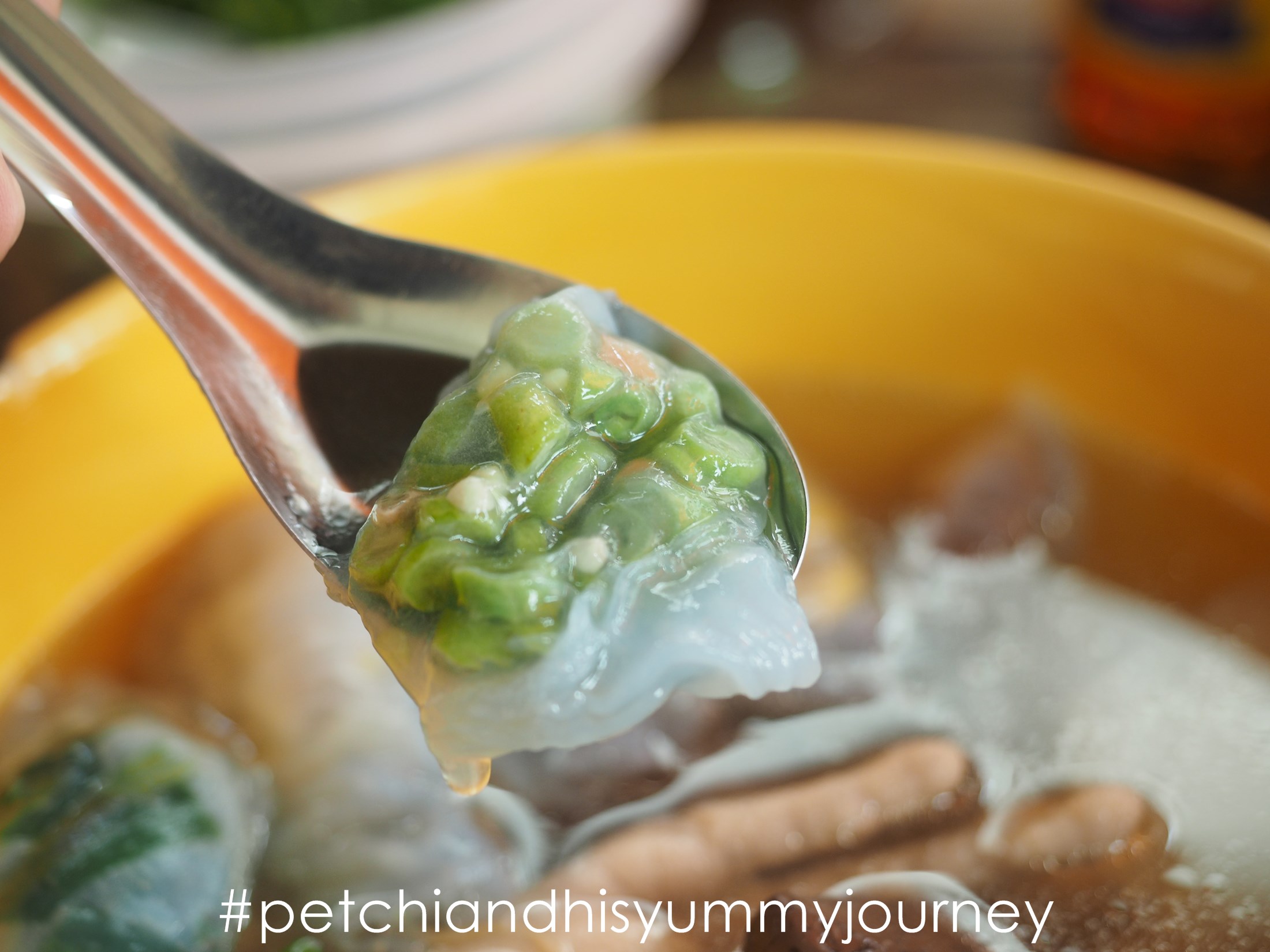 ปากหม้อ เหนียวนุ่ม พร้อมไส้ 7 ไส้ เรียงเป็นตับอยู่ในชาม ผมลงความเห็นว่าอร่อยทุกไส้ ถึงแม้ส่วนใหญ่จะเป็นผักแต่ก็ไม่เหม็นเขียวเลยสักนิด อย่างเช่น ถั่วฝักยาว หรือถั่วงอก ที่โปรดที่สุดคือ ไส้ไชโป้ หวานๆมันเค็มๆปะแล่ม เคี้ยวแล้วหนึบหนับ