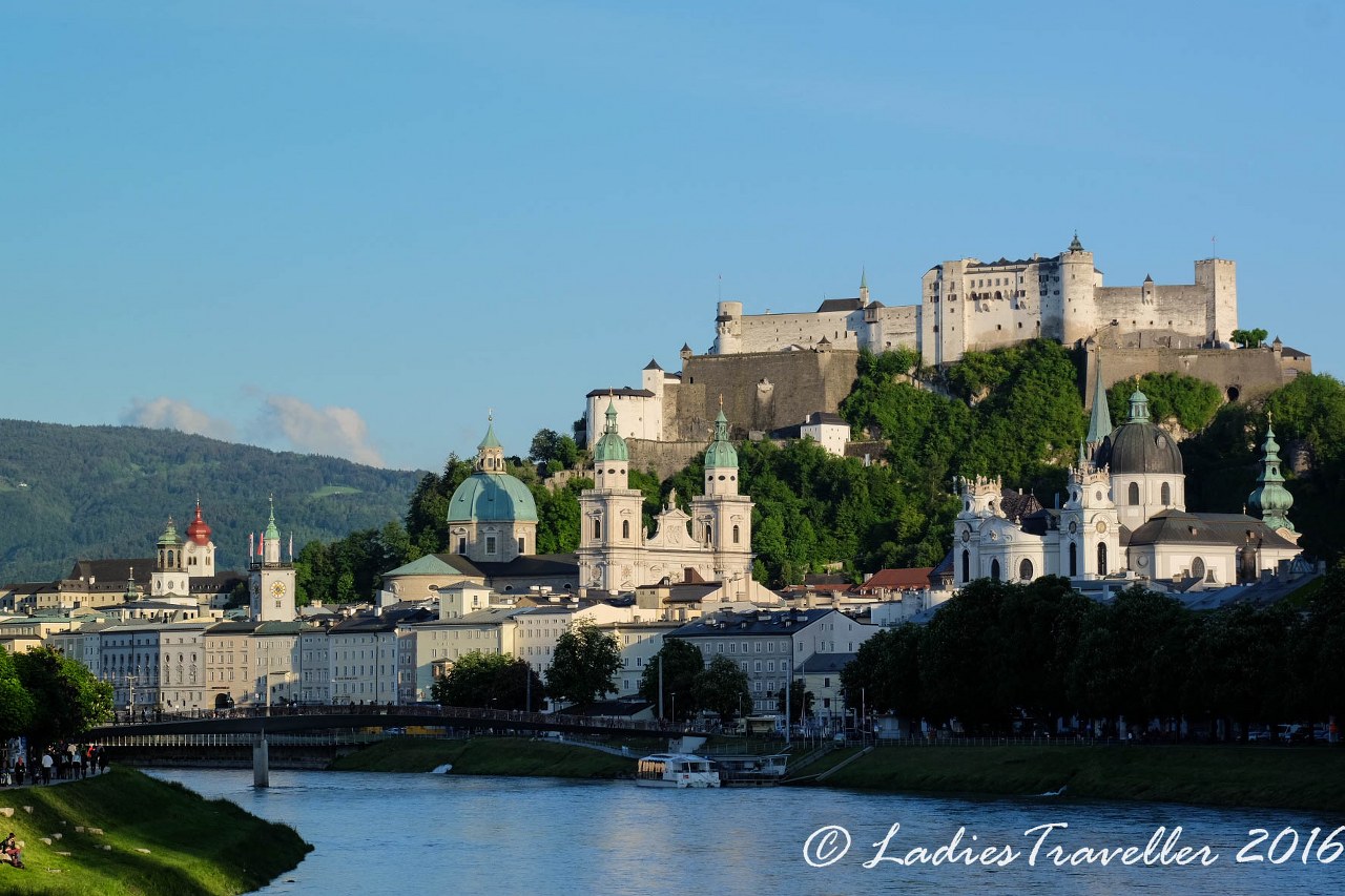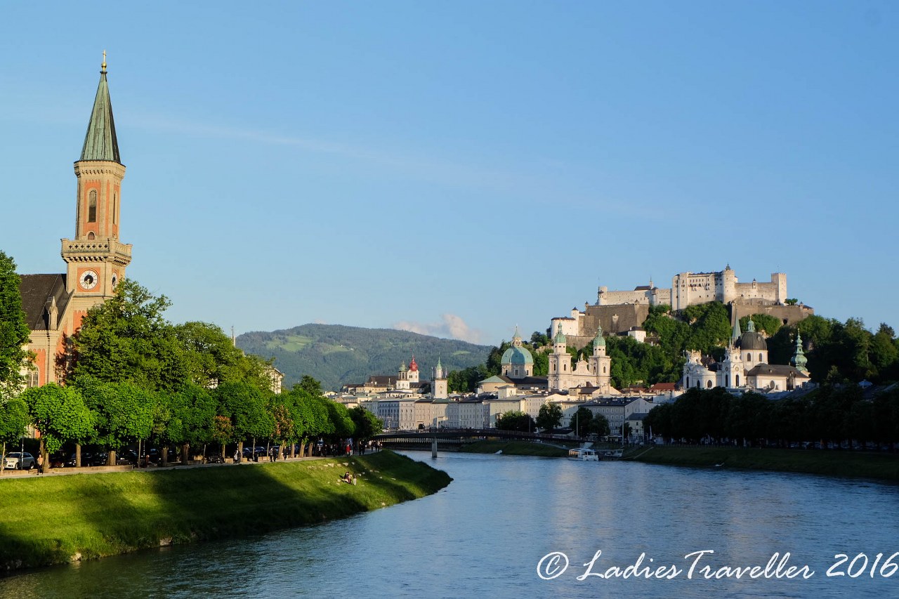 ในที่สุดก็เดินมาถึง สะพานซึ่งเป็นจุดที่เราจะถ่ายภาพวิวที่เป็น Signature view ของ Salzburg การถ่ายภาพต้องเดินไปประมาณกลางสะพาน เพื่อถ่ายให้เห็นเขตเมืองเก่า คู่กับแม่น้ำ Salzach ซึ่งไหลผ่านกลางเมือง พร้อมกับโบสถ์อีกฝั่ง .... ลองจินตนาการถึงภาพแล้ว ช่าง Classic Romantic เสียเหลือเกิน ไม่รู้จะใช้คำไหนอธิบายดี