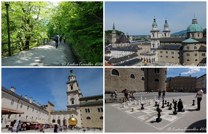 หลังจากชื่นชมป้อมปราการจนรอบ เราก็เดินลงจากป้อมอีกทางหนึ่ง ซึ่งพาเราไปยังอีกมุมของเมือง ซึ่งเป็นอีกจุดสำคัญ ที่นักท่องเที่ยวมักมาเยี่ยมชมกัน เป็นจตุรัสที่มีงานศิลปะซึ่งเป็นฝีมือของนักศึกษามหาวิทยาลัย Salzburg โดยจะเป็นรูปปั้นผู้ชายยืนอยู่บนลูกบอลสีทอง ทำให้ดูแปลกและโดดเด่น และบริเวณแถวนั้นยังมีร้านค้า และลานกิจกรรมที่มีกระดานหมากรุกขนาดใหญ่ อีกด้วย ดูๆไปคล้ายกับไอเดียในภาพยนตร์ Harry potter ตอนศิลาอาถรรพ์ เลยทีเดียว