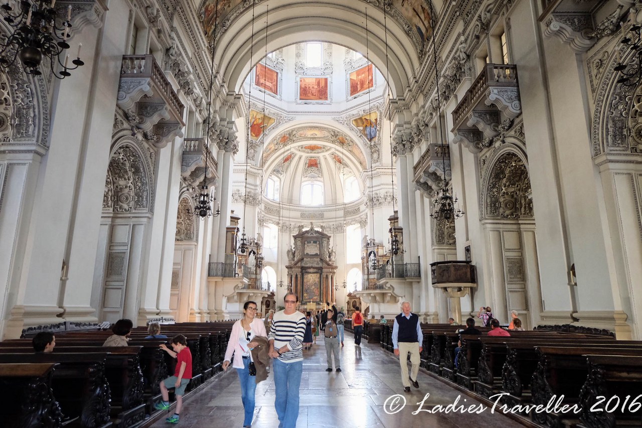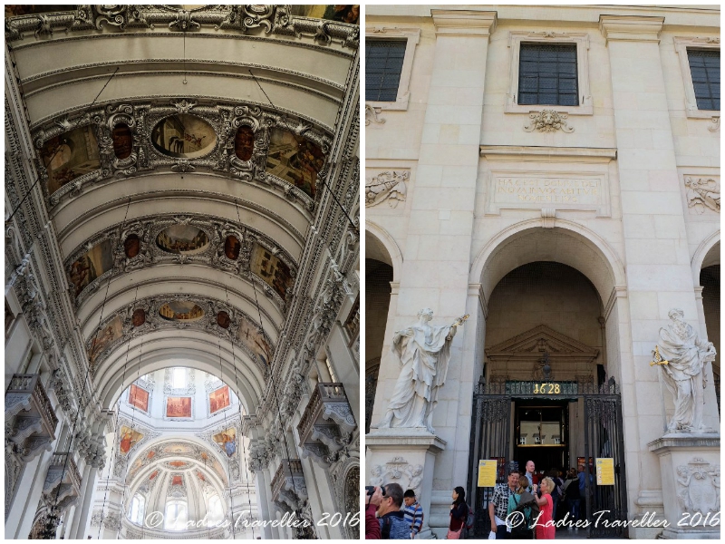 เดินจากตรงนั้นไปอีกนิดเดียว ก็จะเจอมหาวิหาร Salzburg Cathedral ซึ่งเป็นโบสถ์ศิลปะบาโรกที่งดงามมีความโอ่อาตามสไตล์ ความสวยงามที่เห็นนี้เกิดจากการบูรณะครั้งใหญ่หลังจากที่โบสถ์นี้ได้ถูกระเบิดในสมัยสงครามโลกครั้งที่ 2