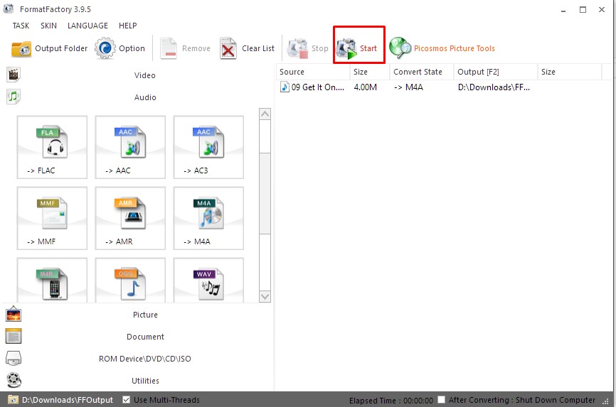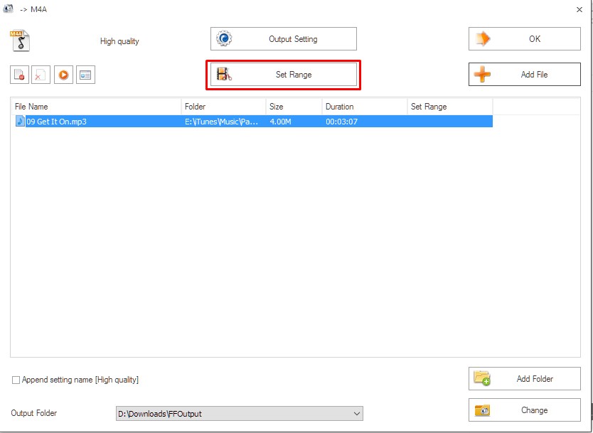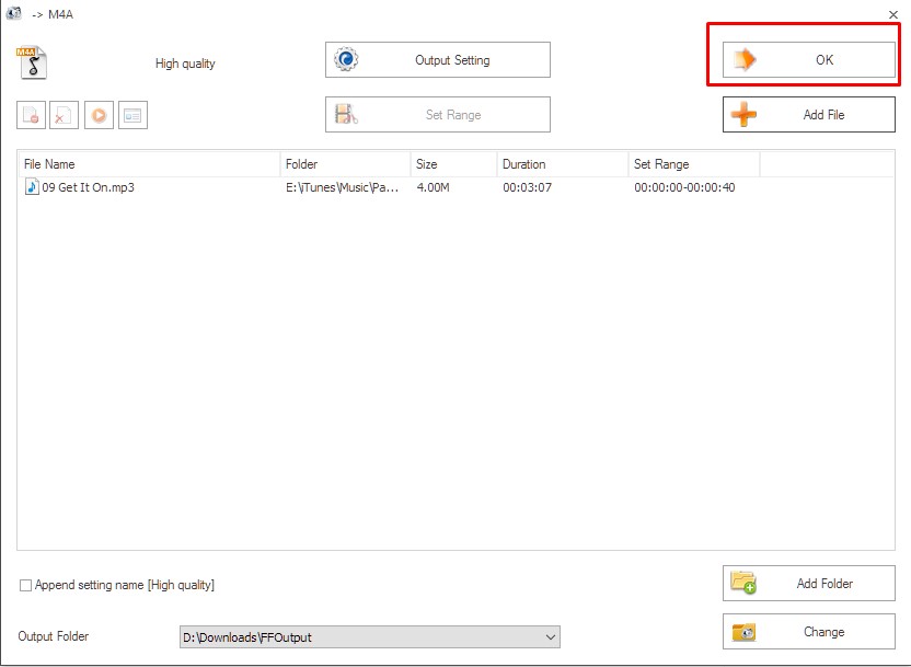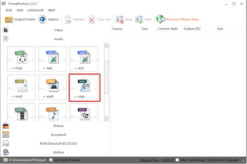 เปิด FormatFactory เลือก M4A คลิกไฟล์เพลงใส่ (ใส่กี่เพลงก็ได้ครับ)