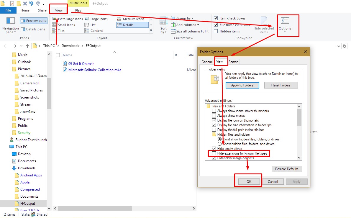ตั้งค่าโฟลเดอร์ให้เห็นนามสกุลไฟล์ ตรงกรอบแดงเอาเครื่องหมายออก