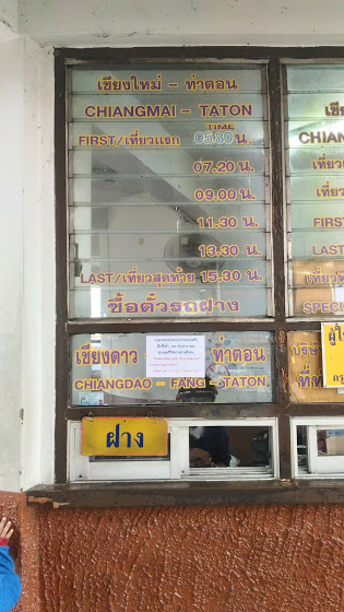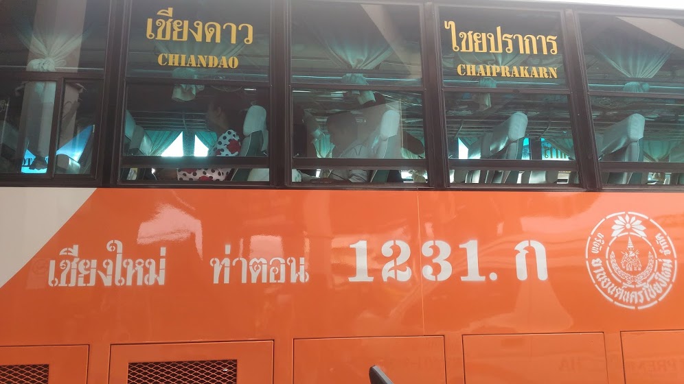 พอกินกาแฟกระชากความสดใสเรียบร้อย เราเรียกเหมาสามล้อต่อไปขนส่งช้างเผือก เพื่อขึ้นรถเมล์ เชียงใหม่-ท่าตอน ไปเชียงดาว ค่ารถนั้น 40 บาทต่อคน ละอ่อน 20บาทเจ้า มีระบุที่นั่งเรียบร้อย อ่อๆ ถ้ามาถึงที่นี่ประมาณ 8 โมงเช้า เราจะได้ยินน้องหมาร้องเพลงชาติด้วย ร้องทั้งเพลง น่าร๊ากก