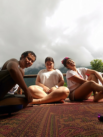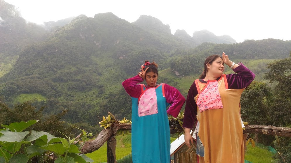 จนในที่สุด เย๊ ระเบียงดาว ที่รอคอย โอ๊ยแก ที่นอนหลักร้อย วิวหลักล้าน เราได้พักห้องใหญ่เพราะนอนกัน 4 คน แต่เค้าเก็บแต่ผู้ใหญ่นะคนละ 500 บาท + อาหารเช้าและเย็น ส่วนเด็กไม่เสีย ถูกเวอร์วังอลังการ ส่วนวิวหน้าห้องพาโนรามามากมาย เราเอาของไปวางที่ห้องนั่งพักสักครู่ และอาบน้ำเปลี่ยนเสื้อผ้า ขอบอกเลยว่ายะเยือก น้ำเย็นโฮกไม่มีเครื่องทำน้ำอุ่นนะแจ๊ะ สั่นๆ แต่อาบเสร็จก็รีเฟรช สดชื่น จนช่วงเที่ยงกว่า เราเลยเดินสำรวจตามทางถนนไปเรื่อยๆ ประเด็นคือ หาของกินอีกแล้วววว ได้ไปนั่งกินร้านป้าคนนึง ใจดีมาก อาหารใช้ได้ วิวดี๊ ดี ให้เพื่อนอีก2คน ไปสั่ง เหมือนเดิมจร้า สั่งกระหน่ำกันไปเลย กับข้าว 5-6อย่าง กองทัพต้องเดินด้วยท้อง ท่องไว้ๆ ป้าเจ้าของร้านให้ยืมชุดชาวเผ่าเข้าใส่ถ่าบรูปด้วย น่าร๊าก กินเสร็จ จ่ายเงิน เราก็เดินลัดกลับมาที่ระเบียงดาว สั่งกาแฟ ชมวิว ที่ระเบียงหน้าห้อง สำรับมื้อเย็นเรานั้นเริ่มตั้งแต่ 5 โมง ถึง 6 โมง ในสำรับนั้นมีแกงจืด น้ำพริกระเบียงดาว ไข่เจียว ผัดผัก ข้าวเปล่ามาเป็นโถ กินกันสนุกสนานอิ่มจุก อร่อยเลยทีเดียว กับข้าวอร่อยๆพร้อมวิวดีๆ กินเสร็จก็เดินกลับมาที่ห้อง ปูเสื่อที่ระเบียงนั่งคุยกัน พอมืดหน่อยก็เอาหมอนผ้าห่มมานอนดูดาว ที่ระยิบระยับเต็มท้องฟ้า เห็นหมอกมาปกคลุม เป็นระรอกๆ มันช่างดีงาม พอถึงเวลาอันสมควรสัก 4-5 ทุ่มเราก็เข้านอนจร้า เพื่อที่จะตื่นมาดูหมอก