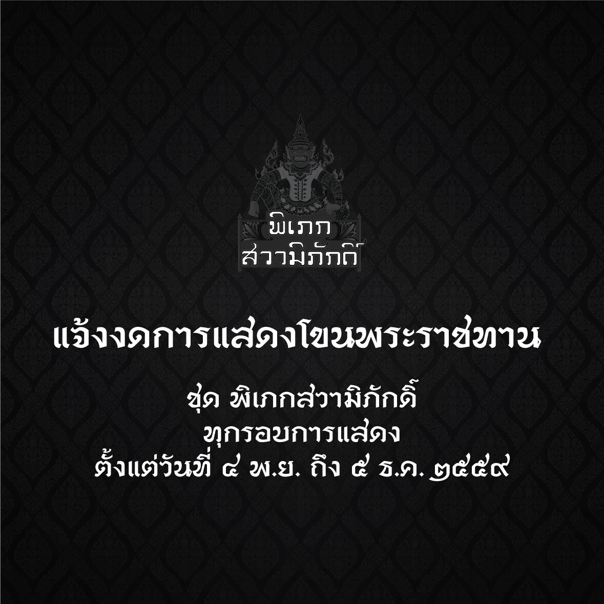 ม.ล.ปิยาภัสร์ ภิรมย์ภักดี รองประธานคณะกรรมการอำนวยการ โขนมูลนิธิส่งเสริมศิลปาชีพฯ ได้แจ้งข่าวงดการแสดงแสดงโขนมูลนิธิส่งเสริมศิลปาชีพฯ “ตอน พิเภกสวามิภักดิ์” ทุกรอบการแสดง ตั้งแต่วันที่ 5 พฤศจิกายน – 5 ธันวาคม 2559 สำหรับผู้ชมที่ซื้อบัตรแล้ว สามารถขอคืนบัตรการแสดงได้ที่จุดจำหน่ายไทยทิคเก็ตเมเจอร์ 14 สาขาหลัก ได้แก่