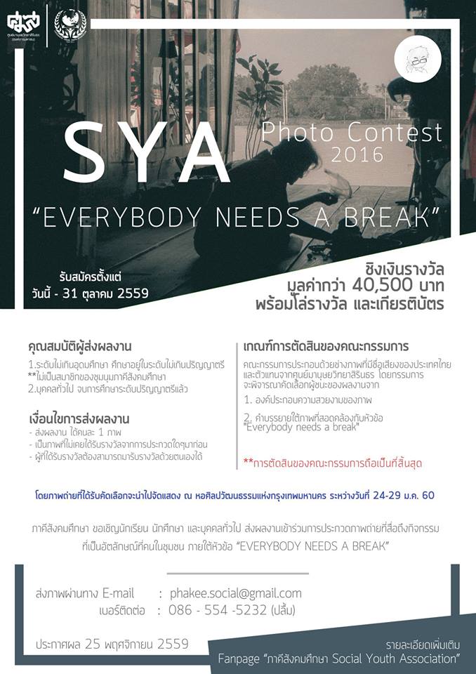 ภาคีสังคมศึกษาขอเชิญนักเรียน นักศึกษา เเละบุคคลทั่วไป ส่งผลงานเข้าร่วมการประกวดภาพถ่ายที่สื่อถึงกิจกรรมที่เป็นอัตลักษณ์ของคนในชุมชน ภายใต้หัวข้อ “Everybody needs a break” ชิงเงินรางวัลมูลค่ากว่า 40,500 บาทพร้อมทั้งเกียรติบัตร ส่งภาพได้ตั้งเเต่วันนี้ - 31 ตุลาคมนี้