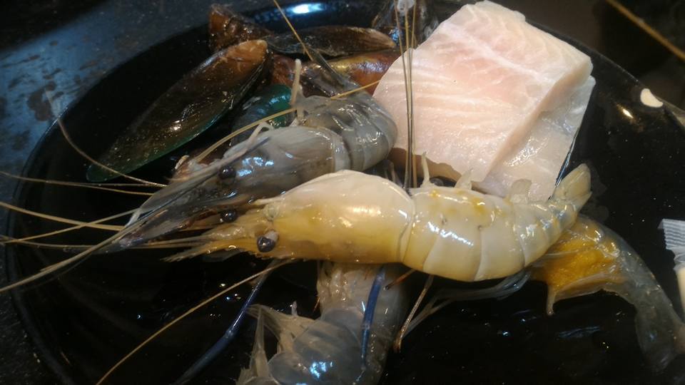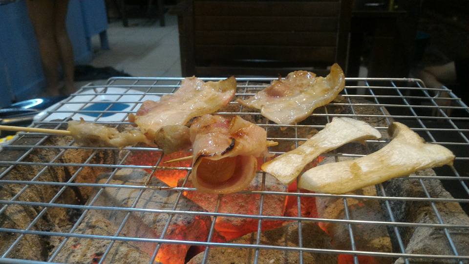 พอถึงคิวเราเท่านั้นแหละครับ เตาก็จะเป็นเตาถ่านปิ้งที่เราจะเห็นได้ตามร้านปิ๊งย่างปกติ โดยอาหารที่มี (เท่าที่เห็น) นั้นก็จะมีอาหารทะเลสดๆ นั่นก็คือ ปู , กุ้ง คำว่าสดนี่คือสดจริงๆ เป็นๆ ก้าม หนวดกระดิกไปมาเยอะ , มีปลาหั่นพร้อมย่าง , หอยแมลงภู่ , หอยแครง , ปลาหมีกตัวโคตรใหญ่ , หอยเซลล์ชิ้นบะเริ่ม และปลาอะไรก็ไม่รู้