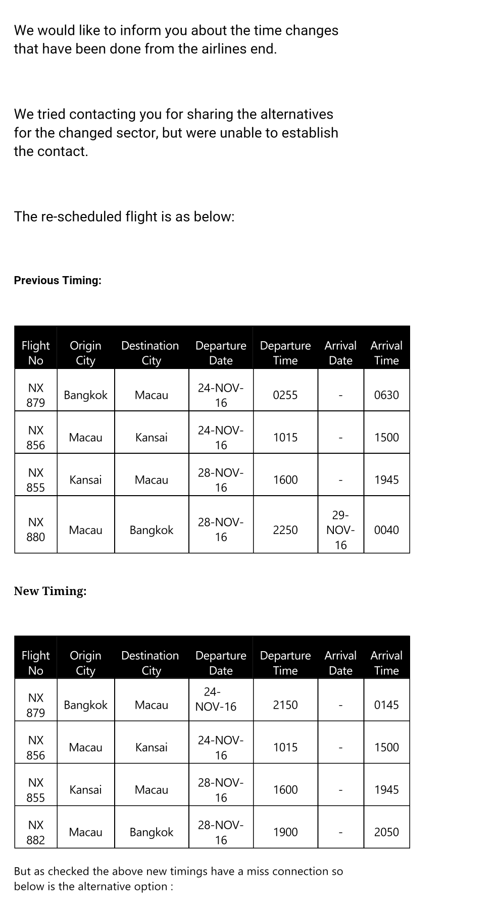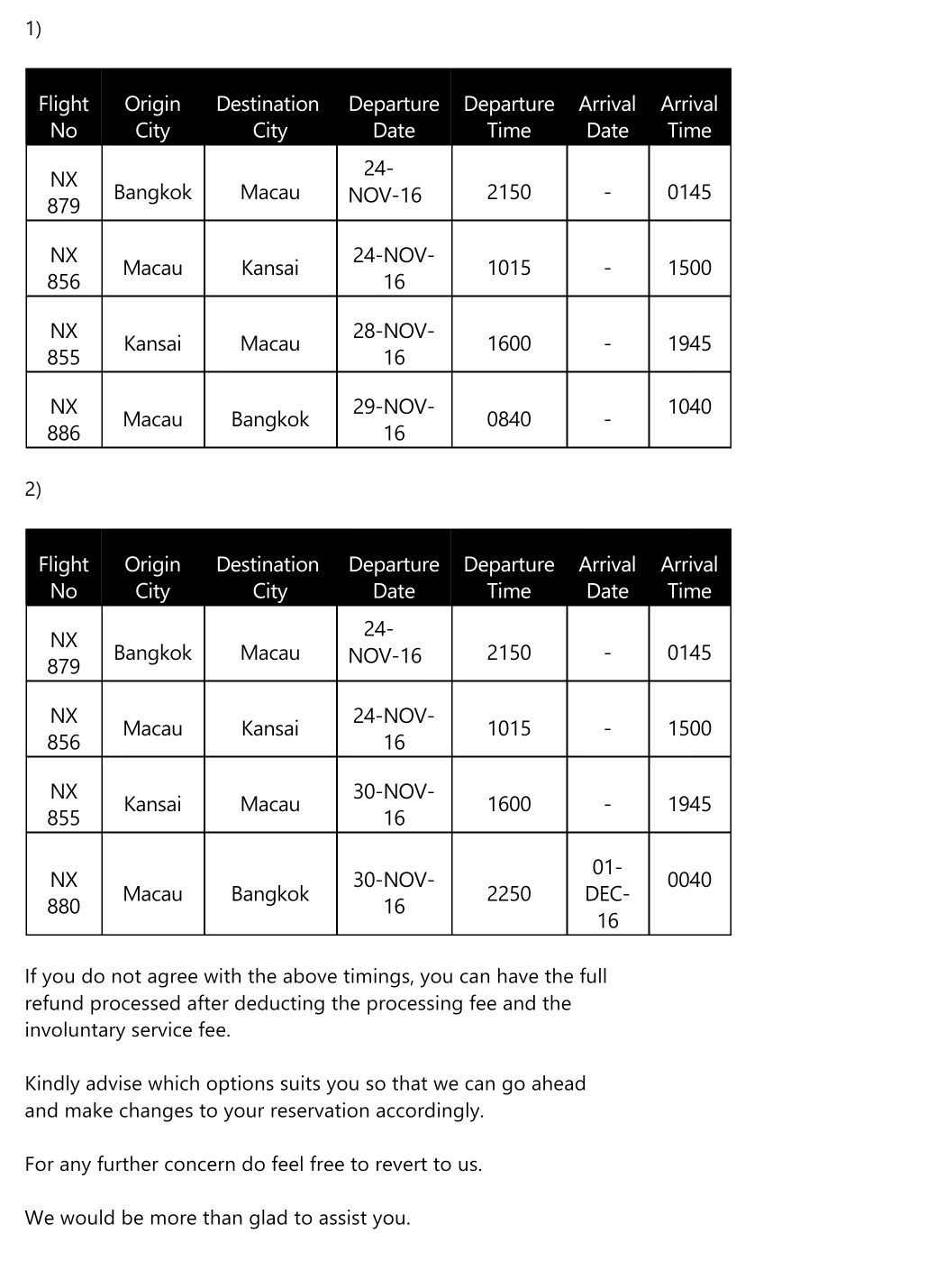 ปลายเดือนมีนาคมที่ผ่านมาผมจองตั๋วเครื่องบินจากกรุงเทพไปยังโอซาก้า ทาง website Skyscanner ซึ่งราคาและช่วงเวลา Transit ที่เหมาะสมในเวลานั้นผมเลือก Macau air แต่พอคลิกซื้อตั๋วกลับเข้าไปยัง Websiteของ Dena Travelซึ่งเป็น agency ไม่ได้เป็นการซื้อโดยตรงกับสายการบิน ลองเช็คข้อมูลดูน่าเชื่อถือจึงทำการซื้อตั๋วจ่ายเงินตัดบัตรไปในทันที คิดว่าไม่น่าจะมีปัญหาเพราะเห็นเพื่อนหลายคนซื้อผ่าน agency แต่สุดท้ายวันศุกร์ที่ผ่านมามีเมลจาก Dena travelแจ้งเปลี่ยนแปลงเวลาในการเดินทางโดยจะได้ transit นานขึ้นจากเดิมประมาณ 3ชม ทั้งขาไปและกลับ กลายเป็น 8-12 ชั่วโมง (ผมเดินทางกับพ่อแม่อายุหกสิบกว่าทั้งคู่แค่คิดจะพาพ่อแม่นอนในเก้าอี้สนามบินก็ไม่ไหวละคับ ถ้าเดินทางคนเดียวคงพอไหว หรือจะไปนอนนอกสนามบินที่macauก็ราคาแสนแพง) การ Transitนานขึ้น ทำให้กลับถึงไทยช้าลง ผมต้องเลื่อนตั๋วเครื่องบินจากกทม กลับ ตจวอีกต่อหนึ่งด้วย อีกทางเลือกที่ให้มาคือ Refund