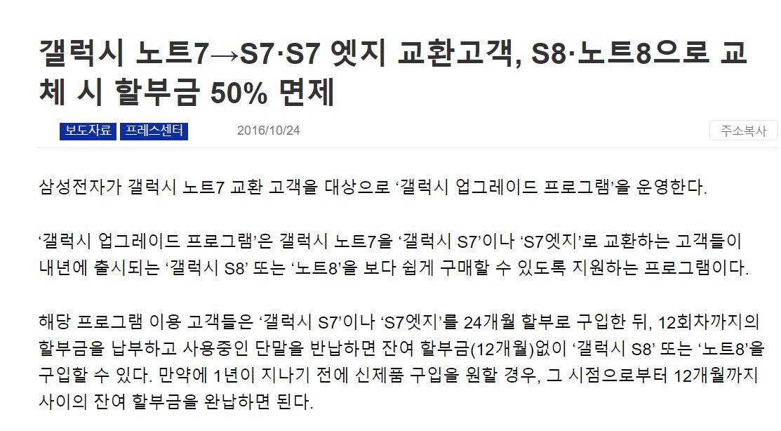 นโยบายของซัมซุงจะให้ลูกค้า Note 7 ปัจจุบัน เปลี่ยนไปใช้ Galaxy S7 หรือ S7 edge ก่อน (จ่ายราคา 50%) จากนั้นในปีหน้า จะสามารถเปลี่ยนเครื่องเป็น Galaxy S8 หรือ Note 8 ได้โดยไม่เสียค่าใช้จ่ายเพิ่มเติม