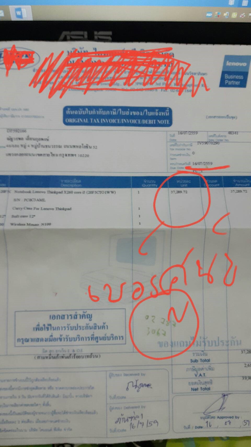 ตัวเลือกที่มีอยู่ แน่นอน คงต้องมี Apple Notebook เป็นหนึ่งในตัวเลือกอยู่แน่นอน แต่เดี๋ยวก่อน ที่ผมไม่คิดจะใช้รุ่นนี้ ไม่มีอะไรมากคงเป็นเหตุผลที่เหมือนกับหลายๆ ท่าน เปรียบเหมือนกับท่านเวลาเลือกซื้อรถยนต์ ชื่อ TOYOTA มักเป็นทางเลือกลำดับต้นๆ (มีเพื่อนเยอะดี อย่างน้อยก็พี่ๆ แท็กซี่) ดังนั้นตัวเลือกที่เข้ามา (ไม่รู้ว่าเป็นเพราะปีชง 100% หรือ ปล่าว) ทำให้ยี่ห้อนี้โผล่เข้ามา ทุกท่านเคยได้ยิน Notebook ในตำนาน ใช่แล้วมันคือ “IBM” ตระกูล Thinkpad ที่ ณ ขณะที่ผมได้มีโอกาสใช้งานในเวลาสั้นๆ ก็ยังใช้งานปุ่มแดงๆ นั้นไม่เป็น) ปัจจุบันมันคือ Lenovo ตัวที่ผมเลือก เป็นตัวที่เน้นใช้งานกับพนักงาน Office เร็ว อึด บางเบา ใช่แล้วมันตัวเลือกของผม คือ Lenovo Thinkpad X260 core i5 กับราคา 39,990 บาท นับเป็น Notebook ตัวที่แพง และผมคาดหวังไว้กับการใช้งานที่คุ้มค่ามากที่สุด วันที่ซื้อ คือวันที่ 16 กรกฎาคม พ.ศ.2559 ณ ร้านตัวแทนจำหน่ายแห่งหนึ่งที่ฟอร์จูน รัชดา ชั้น 3 (ภาพที่ 1: รายละเอียดใบเสร็จ)