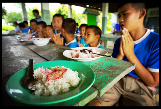 4. ต่อแถวรับอาหาร แทรกกันไปมา แย่งกันเลือกแต่ของดีๆ ทั้งๆที่พ่อบอกให้เรารักกัน