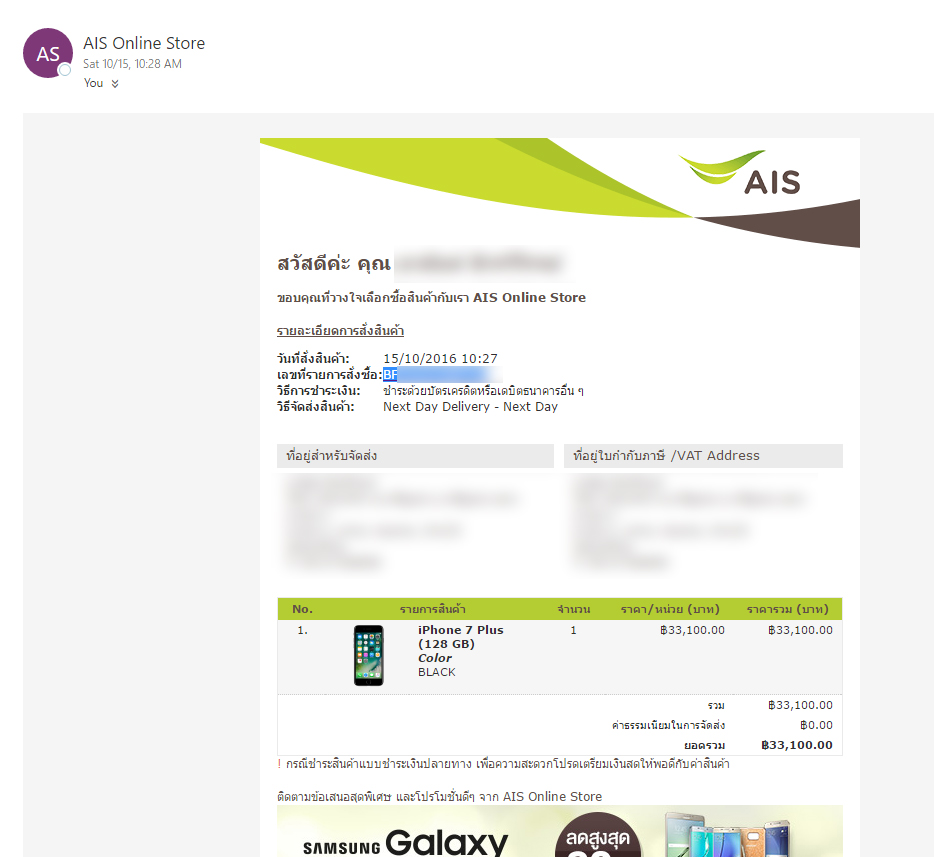 1. รูปนี้เป็น อีเมล์ใบรายละเอียดสั่งซื้อ ที่ได้รับจากทาง AIS Online Store แจ้งว่าวันที่สั่งสินค้า 15/10/2016 10:27