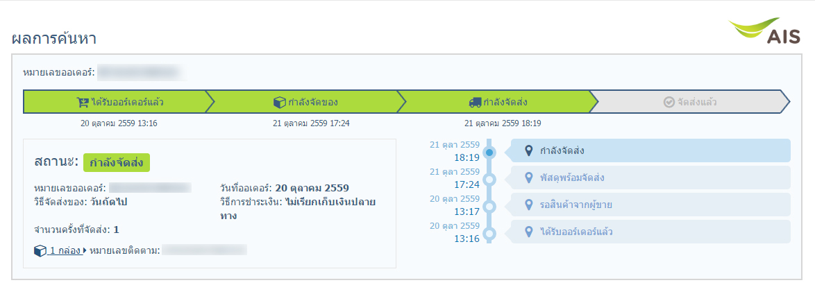 สวัสดีครับ คือผมสั่งซื้อไปตั้งแต่วันที่ 15 ตุลาคม 2559 ผ่านทาง AIS Online Store วันพฤหัสบดีที่แล้ว (20 ตุลาคม 2559) มีพนักงานโทรมาแจ้งคอนเฟิร์มออเดอร์เรียบร้อยและพร้อมบอกว่าจัดส่งแล้วคาดว่าจะได้รับประมาณ วันจันทร์ 24 ตุลาคม 2559 แต่ก็ไร้วี่แวว ซึ่งผมก็เข้าใจเพราะว่าคงเป็นเพราะวันหยุดชดเชย นี่ก็ล่วงเลยมาวันพุธแล้ว ไม่มีใครติดต่อมาเพื่อส่งสินค้าให้เลย!! คืออะไร?? เงินคุณได้รับไปแล้วนะครับ บิลบัตรเครดิตก็ใกล้จะมาเรียกเก็บแล้ว แต่เครื่องยังไม่ได้ใช้เลย คืออะไรอะครับ? มันใช่หรอ
