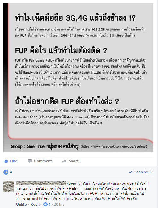 ซึ่งผมได้เข้าไปดูก็พบว่า เป็นกลุ่มของคนที่ใช้เครือข่ายนี้ มีการรีโพสโปรโมชั่นแบบชัดเจน มีการโพสท์ถามคำถาม ซึ่งหลายคนรวมถึงผมเองก็อยากรู้ มีคนมาตอบแบบชัดเจนไม่หลังไมค์