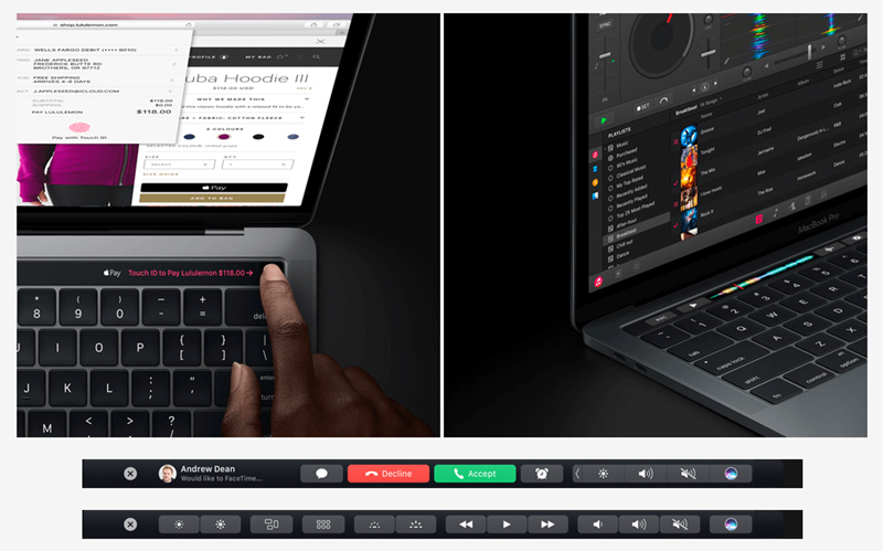 TouchBar คาดว่าเป็นแถบแสดงปุ่มลัดซึ่งขึ้นอยู่กับแอปฯ ที่เราใช้งาน มีประโยชน์หลากหลาย มีความยืดหยุ่น สามารถใช้ได้กับ Safari คาดการณ์การพิมพ์หรือเลือกอิโมจิ ปรับระดับเสียง แก้ไขรูปภาพ ควบคุมวิดีโอโดยไม่ต้องออกจากโหมดเต็มหน้าจอ