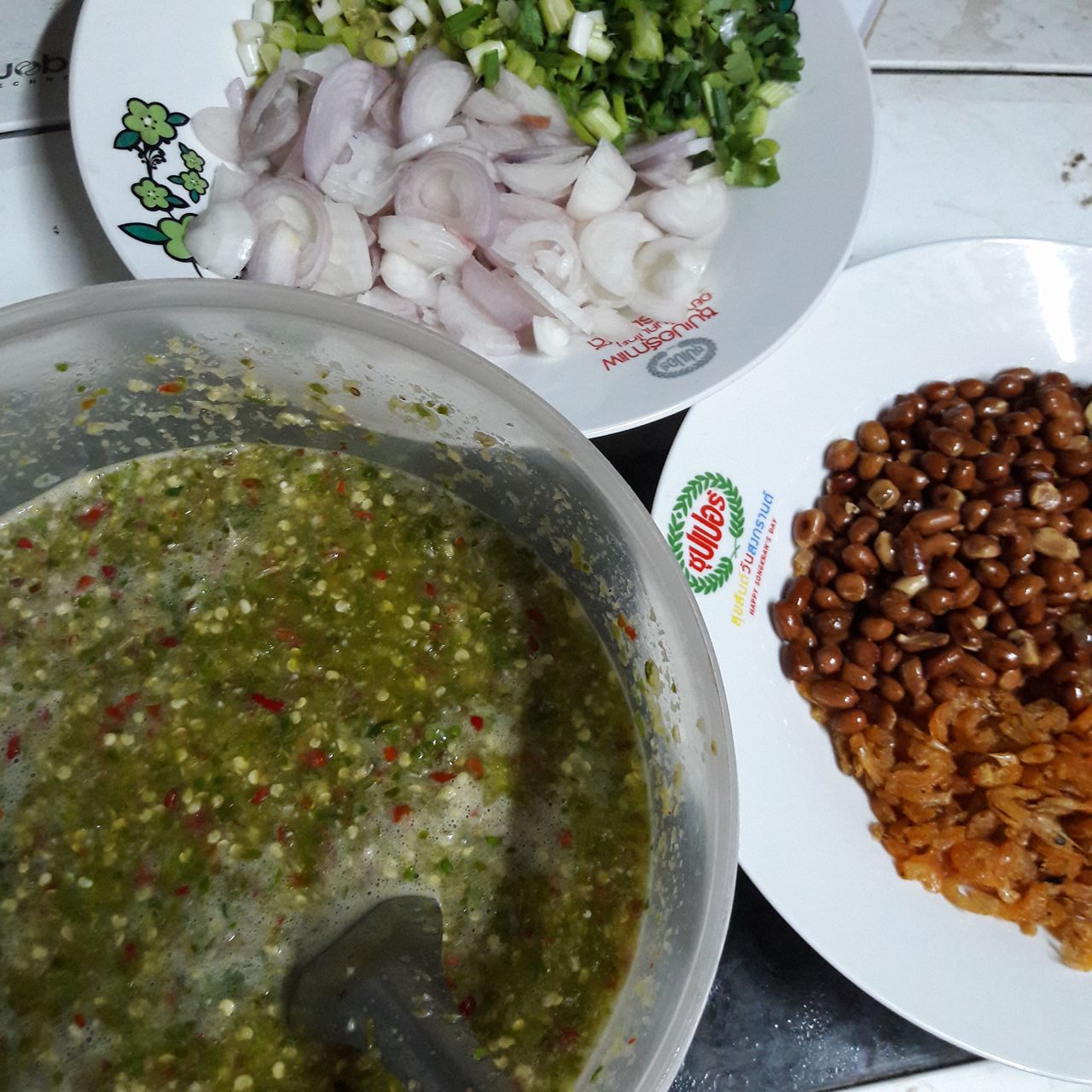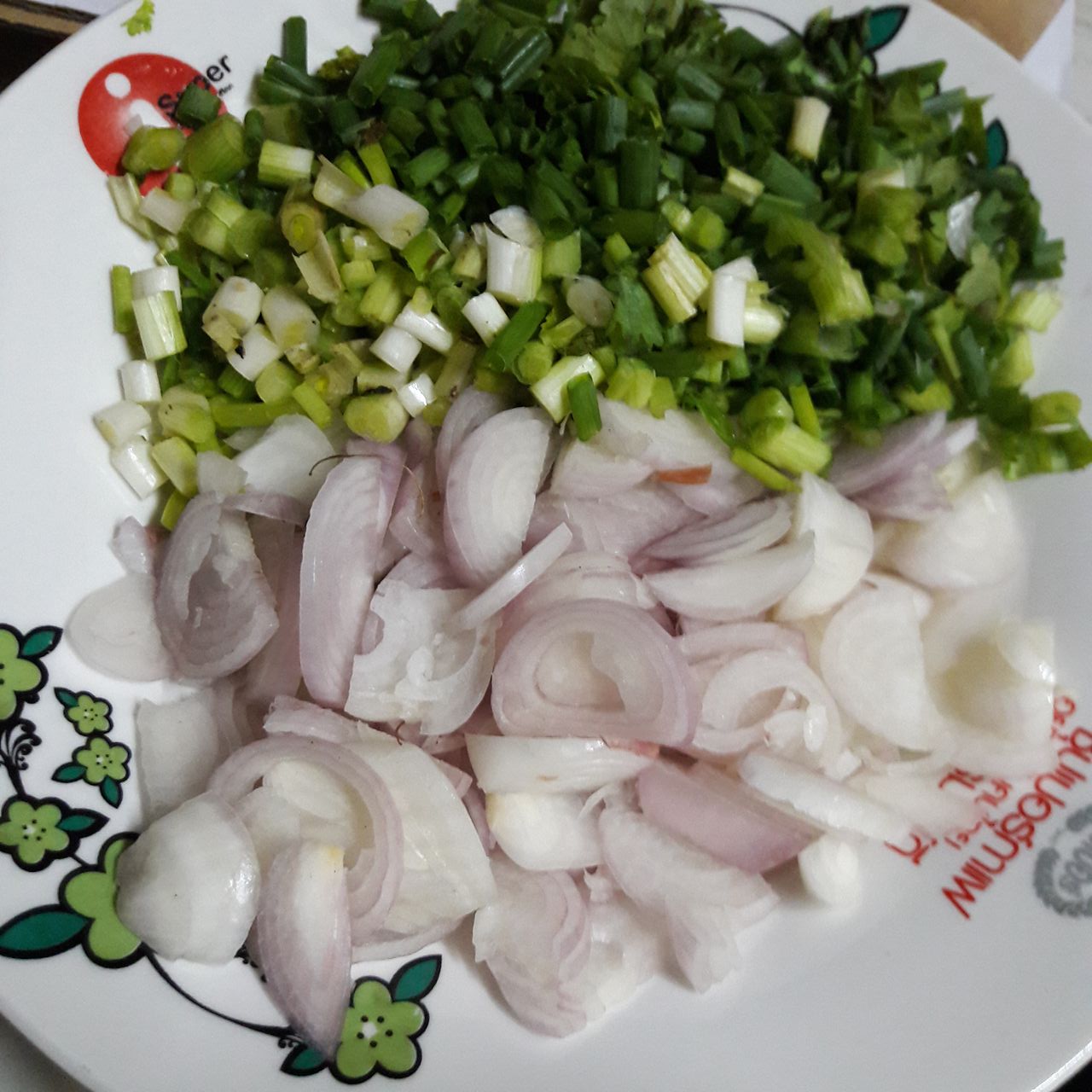 จากนั้น ซอยหอมแดง ถ้าใครชอบเผ็ดอีก ก็ซอยพริกด้วย แต่ดิฉันพอแล้ว เพราะน้ำจิ้ม หรือ น้ำยำ แซ่บปากพองมาก และ ก็ซอยต้นหอม ผักชี เตรียมพักไว้