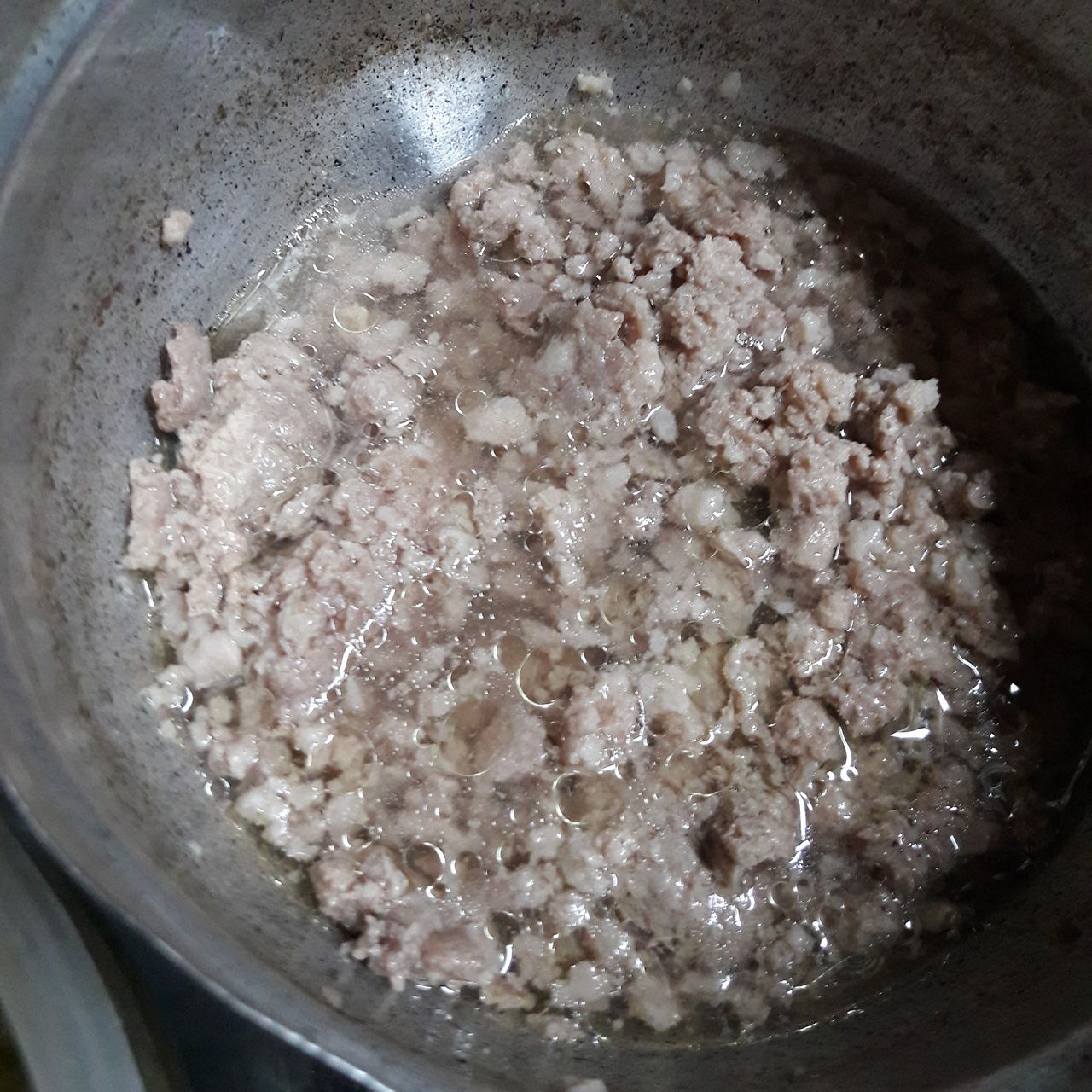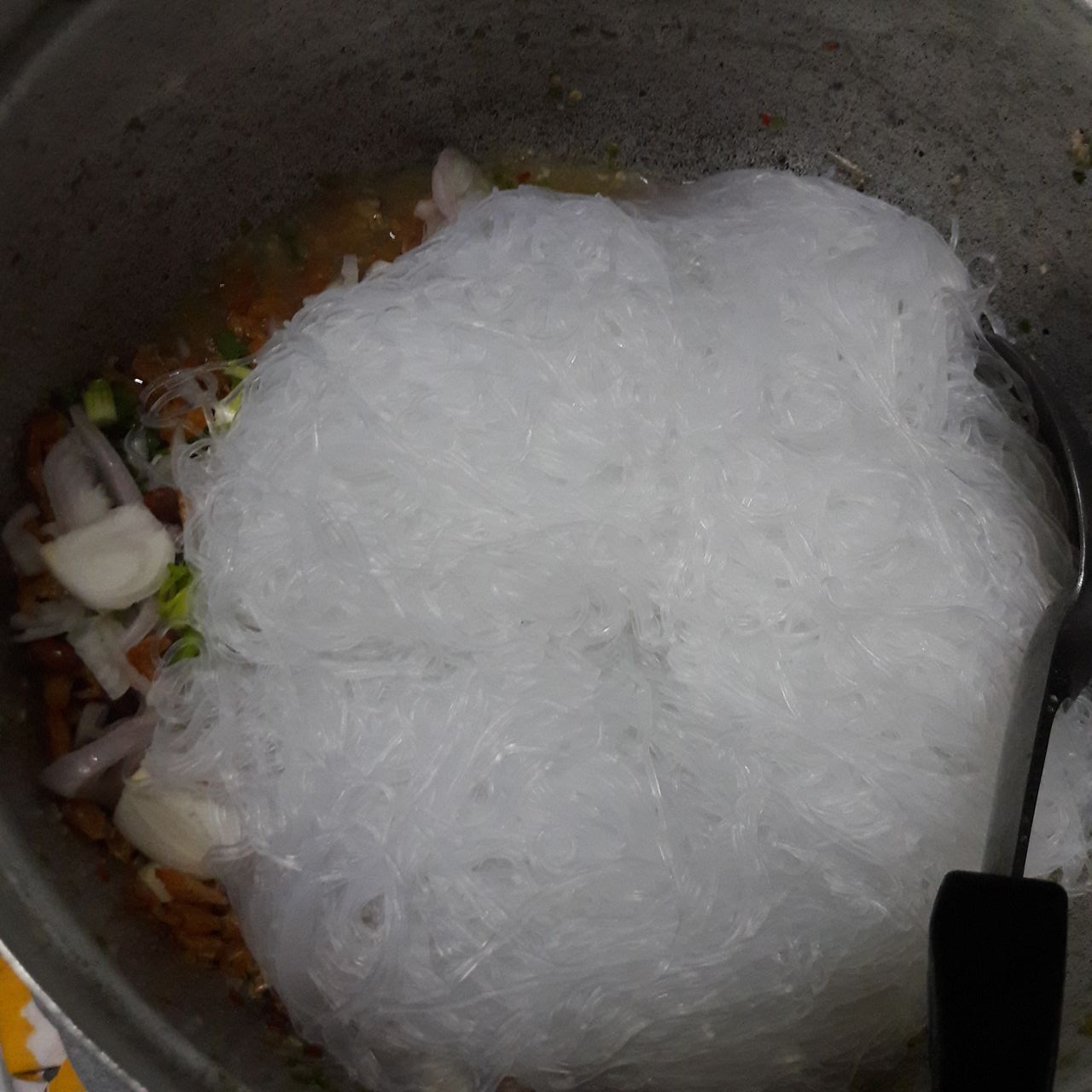จากนั้น เอาหม้อ ตั้งไฟ ใส่น้ำ ใส่หมูสับผสมมันนิดหน่อย เพื่อรวนหมูสับให้สุก อย่าสุกเกินไปหมูจะกระด้าง แข็งไม่อร่อย พักไว้ จากนั้นลวกวุ้นเส้น ให้สุก พักไว้