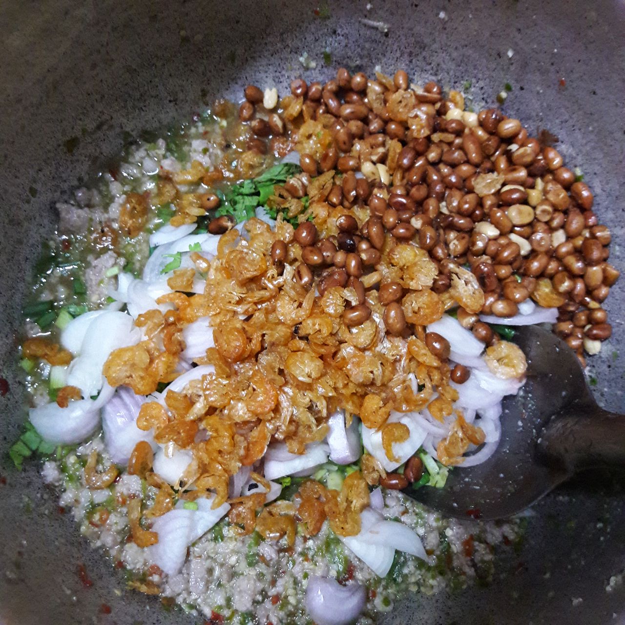 มาขั้นตอนการยำ ใส่หมูสับที่รวนเอาไว้แล้ว ใส่น้ำยำ ใส่กุ้งแห้งทอด ถั่วลิสงคั่ว ผักที่ซอยเอาไว้ คนสักหน่อย ชิมรสก่อนอีกครั้งตั้องการเพิ่มอะไรหรือเปล่า จากนั้นใส่ วุ้นเส้น แล้วผสมให้เข้ากันอีกที ก็เป็น อันเสร็จ กินทันทีที่ปรุงเสร็จ จะอร่อยมากกกกก