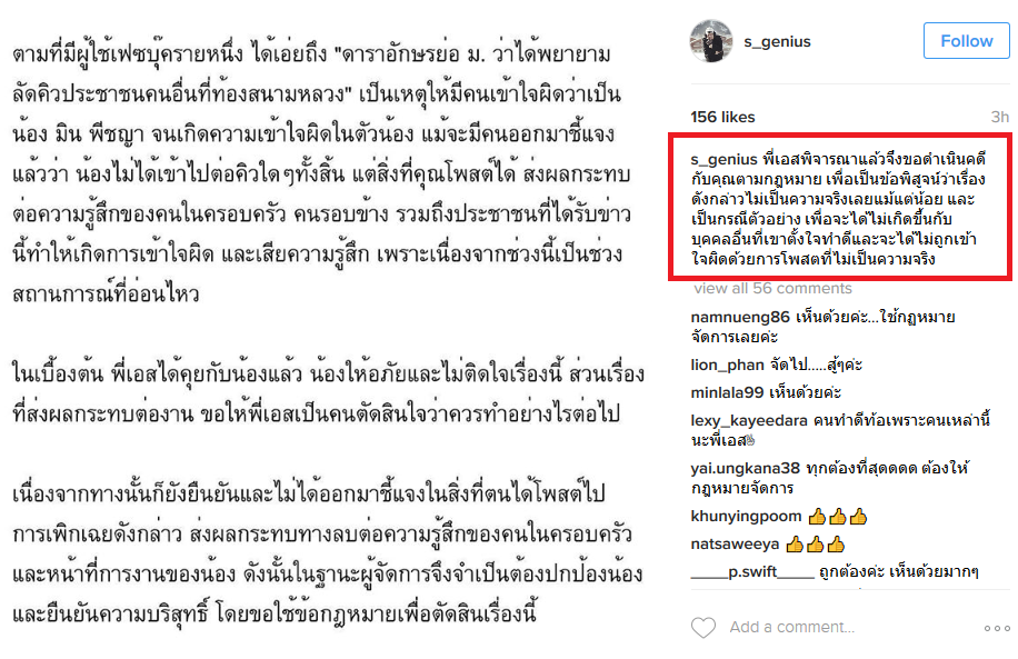 ผู้จัดการ มิน พีชญา ดำเนินการฟ้องร้องคนที่โพสกล่าวหามินเรื่องลัดคิวที่สนามหลวงแล้ว