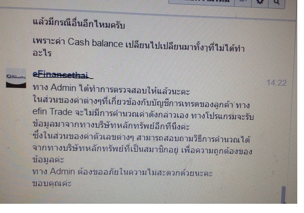 ในการเทรด ผมได้ทำบัญชีเพื่อคำนวณค่าต่างๆ โดยใช้ excel ไว้ก่อน เพื่อเป็นแนวทางก่อนจะเทรดจริง แต่กลายเป็นว่า excel ที่เราได้คำนวณค่าต่างๆเอาไว้มันไม่ตรงกับโปรแกรม ณ เวลานั้น ผมก็ต้องคิดว่า excel ผมผิด เลยเทรดตาม เงินที่เหลือในโปรแกรม เมื่อแก้ปัญหาได้ แต่ก็ต้องแลกด้วยต้นทุนที่มากขึ้น เมื่อกลับมาตรวจสอบอีกครั้งข้อมูลใน excel ก็ตรงกันกับในโปรแกรม เป็นแบบนี้อยู่หลายรอบ จนผมสงสัยและหยุดเทรดในช่วงเวลานานพอสมควรและจับตาดูค่าต่างๆ จึงเห็นว่า ค่า Margin Balance ในโปรแกรม เปลี่ยนไปเปลี่ยนมา เดี๋ยวมีค่ามากกว่าความเป็นจริง เป็นเงิน สองหมื่นกว่าบาท (ถ้าถือสัญญาเดี่ยว 5 สัญญา นั้นคือ เงินเราหายไป เกือบ 30 จุด) ผมได้ทำการ capture หน้าจอ และ ถ่ายวิดีโอไว้ แล้ว และได้ทำการแจ้งเรื่องผ่านเจ้าหน้าที่การตลาด และใช้เวลาในการดำเนินเรื่องไปเป็นเวลา 10 วัน ต้นทุนผมที่ต้องจมอยู่กับการใช้ข้อมูลที่ผิดพลาดนั้นสูงขึ้นอย่างมาก เพื่อแก้ปัญหาเฉพาะหน้าเนื่องจากเห็นว่าเงินเหลือน้อย ผมจึงหยุดเทรดชั่วคราวเพื่อเคลียร์ปัญหานี้ แต่ ทางโบรคมองว่ามันเป็นปัญหาของเราครับ ชดเชยได้เล็กน้อย จากการสูญเสียมหาศาล ทั้งโอกาสทำกำไร และต้นทุน (Unreal) ที่สูงกว่าปกติ เพราะเราไม่ได้มีการส่งคำสั่งใดๆไป (ใครจะส่งครับ ถ้าปิดสัญญาเพื่อ take profit แล้วเงินไม่พอกับการแกว่งของสัญญาที่เหลือ หรือจะเปิดสัญญาเพิ่มก็เป็นการเพิ่มภาระกับเงินที่น้อยลง)