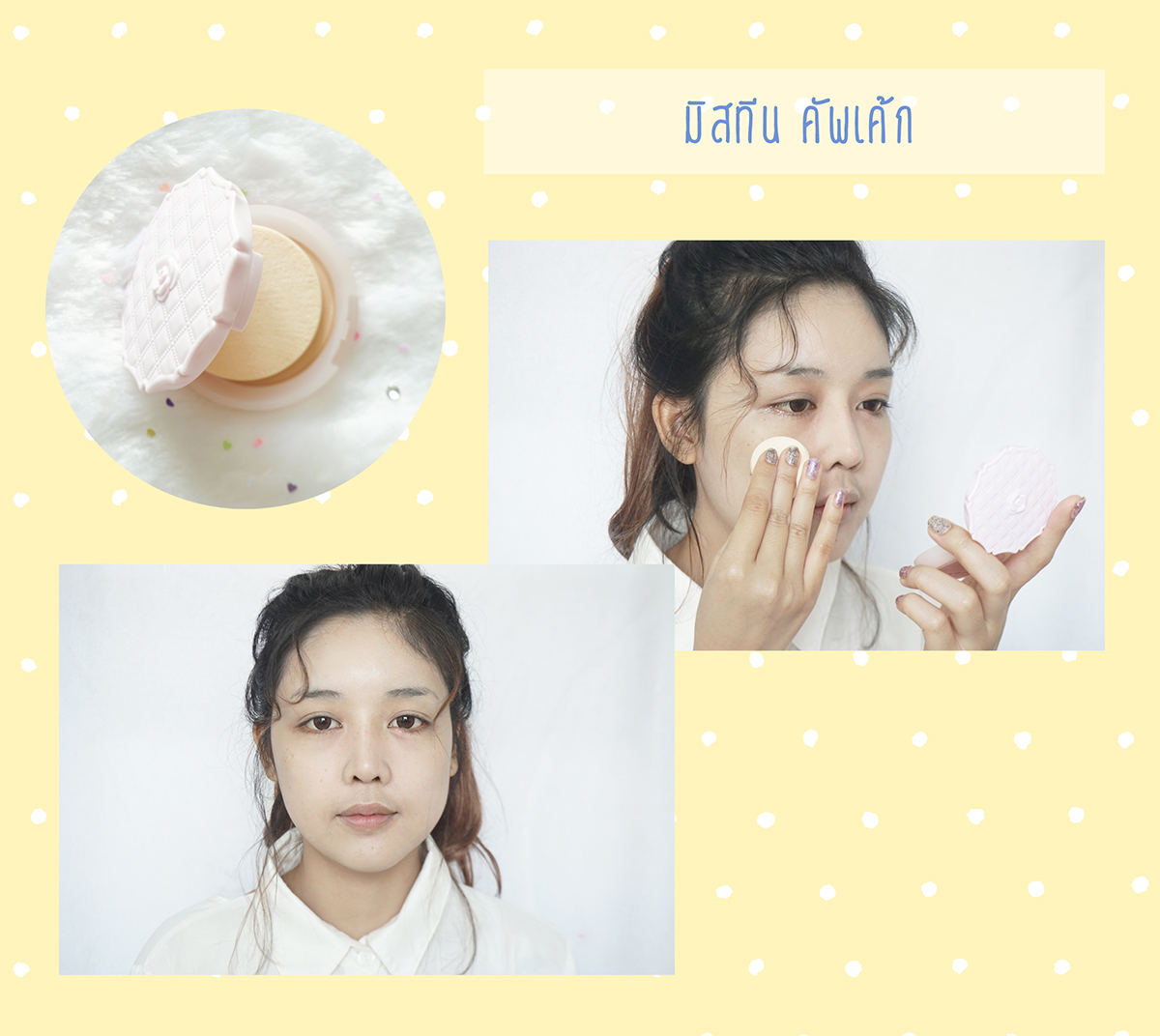 2. หลังจากลง AA แล้วนะคะ อีฟใช้เป็นแป้งพัฟของมิสทีนคัพเค้กค่ะ มีขายในเซเว่น แพ็คเกจน่ารัก ราคาน่าใช้ แค่ 55 บาทเท่านั้น ทำมาในขนาดเล็กๆ พกง่ายค่ะ ก็อีฟจะลงโดยการใช้พัฟค่อยๆแตะๆไปที่ผิวหน้านะคะ จะไม่ใช้การปาดแบบปกติ เพราะต้องการให้หน้าดูไม่หนาจนเกินไปค่ะ