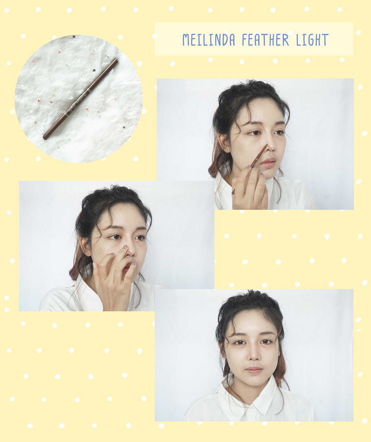 3. ขั้นตอนต่อไปเป็นการเขียนคิ้วนะคะ ลุคส์นี้อีฟจะเขียนคิ้วให้ดูเป็นธรรมชาติหน่อยค่ะ โดยการที่จะไม่วาดโครงคิ้วนะคะ แต่เลือกสีให้ใกล้เคียงกับสีผมของเรา วันนี้อีฟเลือกเป็นที่เขียนคิ้วของ Meilinda ค่ะ ราคา 149 บาทเท่านั้น แท่งบางๆเขียนง่ายดีค่ะ อีฟก็จะค่อยๆระบายตามรูปคิ้วเดิมที่มีอยู่แล้วบางๆค่ะ แล้วใช้แปรงอีกด้านเบลนด์สีให้ฟุ้งขึ้นค่ะ