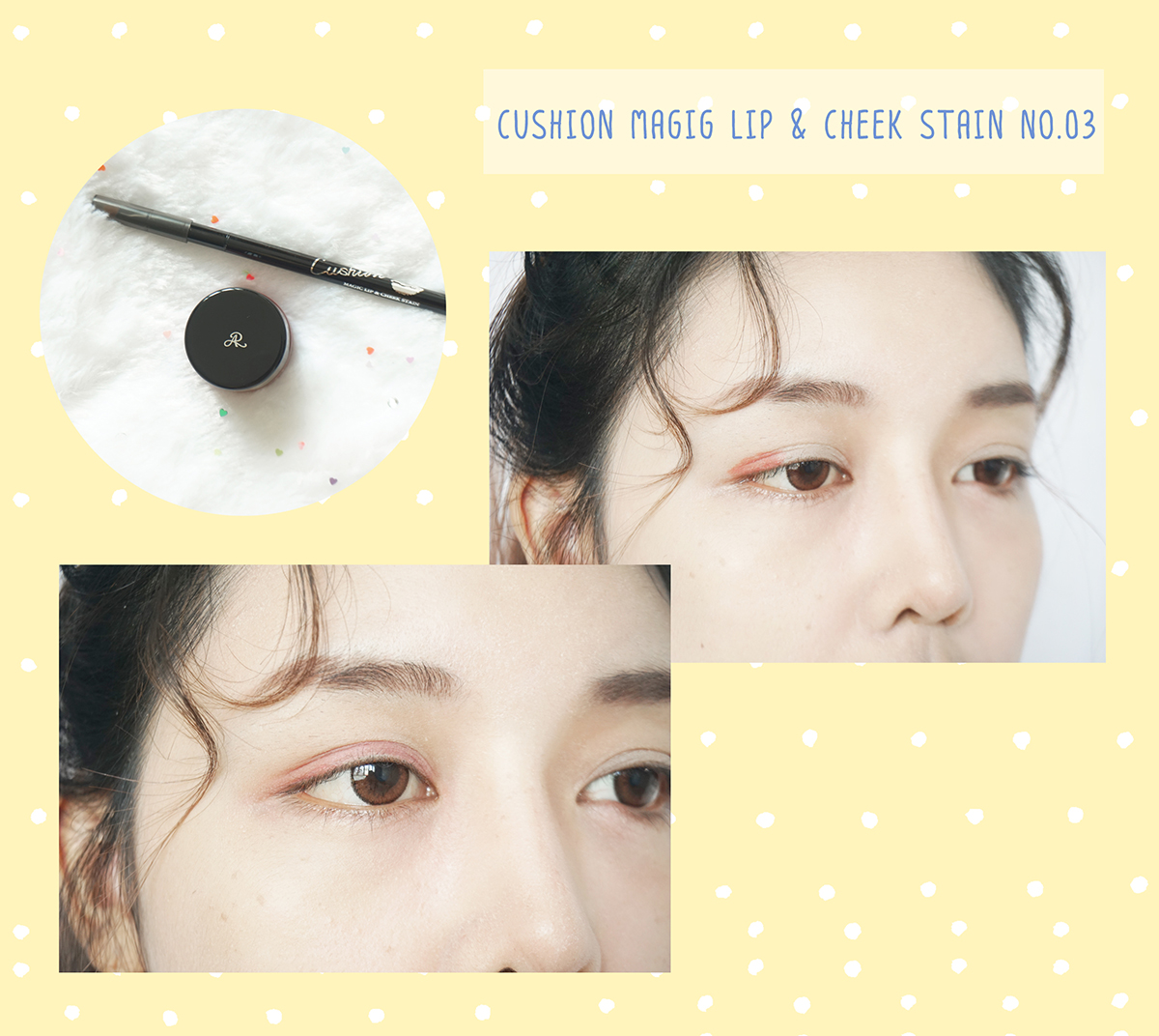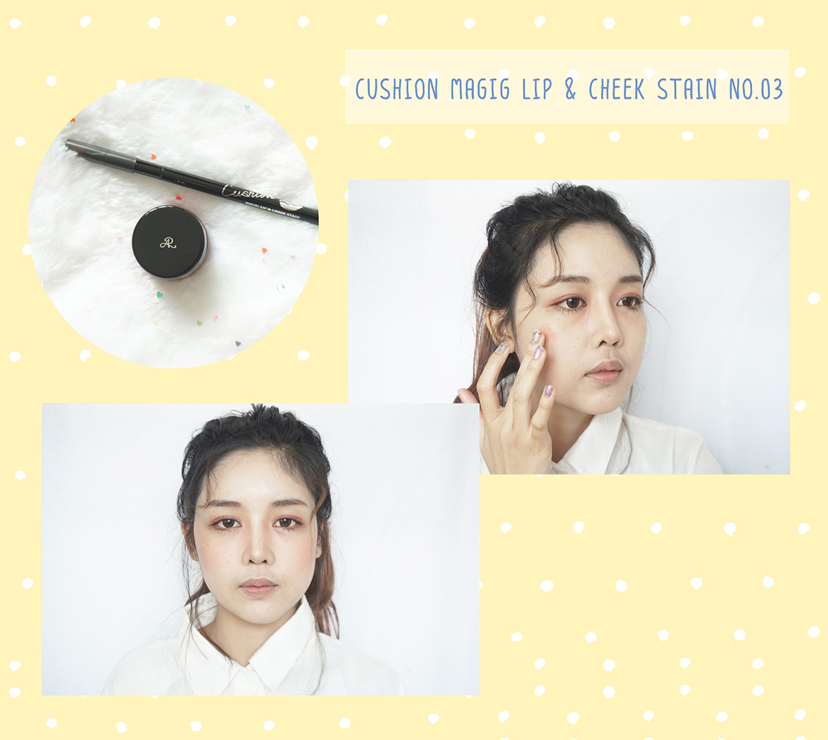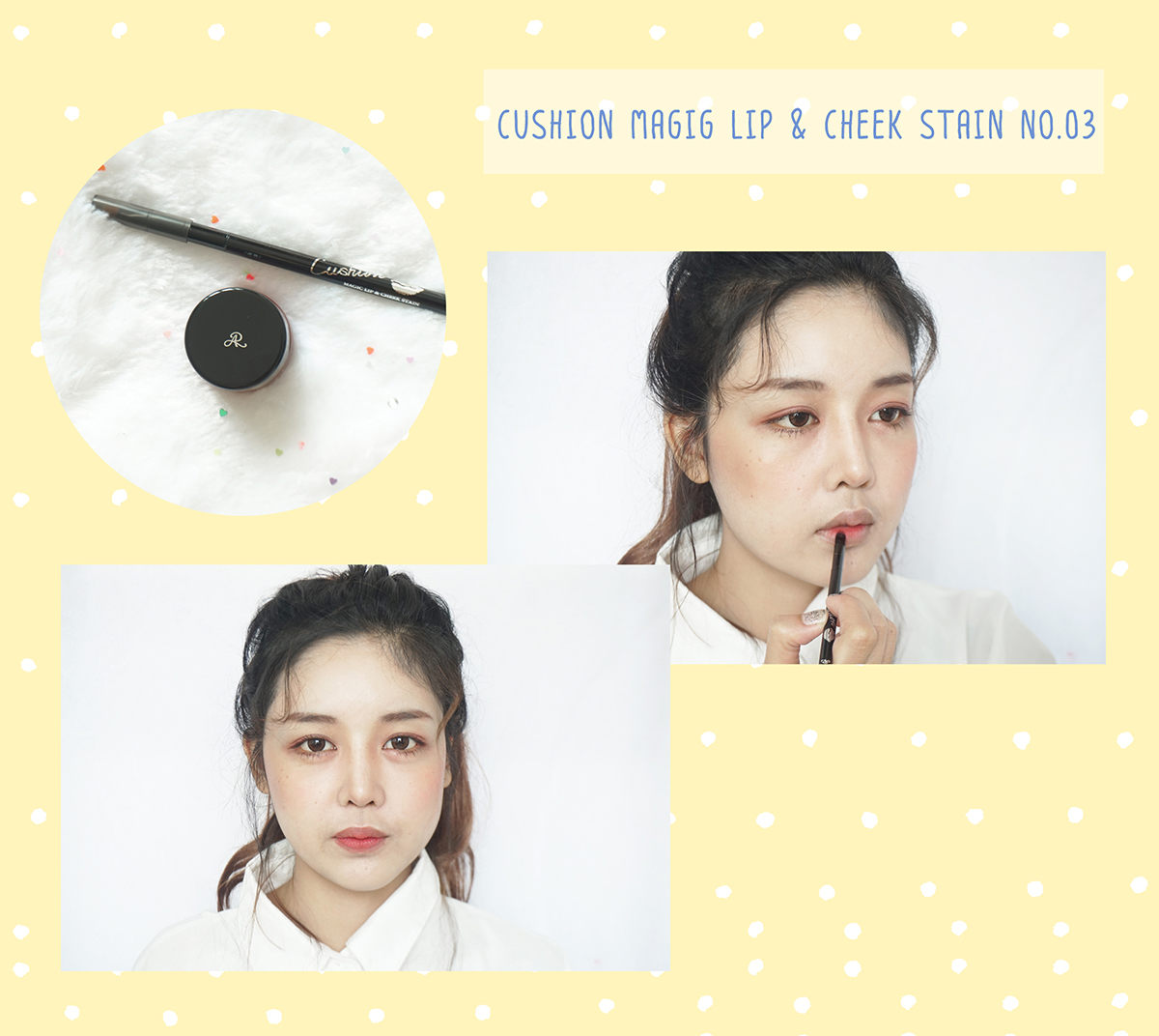 8. ต่อไปใช้คุชชันลิปตัวเดิมทาที่แก้มนะคะ แตะน้อยๆเหมือนเดิมค่ะ แค่ให้แก้มพอมีสี น่ารักๆ (แนะนำให้แตะทีละข้างแล้วเบลนด์เลยนะคะ ไม่งั้นจะเบลนด์ยากเพราะตัวเนื้อค่อนข้างแห้งไวค่ะ)