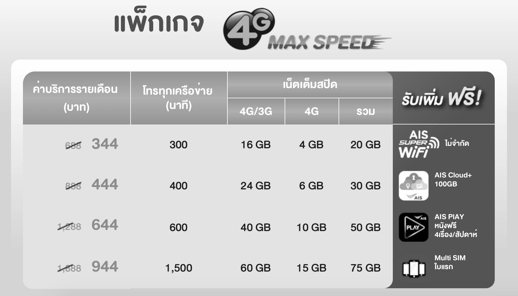 ขอบคุณที่สนใจย้ายค่ายมาใช้งานในครอบคร้ว AIS จะได้รับสิทธิ์แพ็กเกจ 4G MAX SPEED ลด 50% ใช้งาน 12 เดือน และ สำหรับ Multi SIM สมัครบริการภายในวันที่ 31/11/2016 จะได้รับสิทธิ์ SIM ใบแรก ฟรีค่าธรรมเนียม (50 บาท) และ บริการรายเดือน (20 บาท/ซิม/เดือน นาน 12 เดือน) ค่ะ