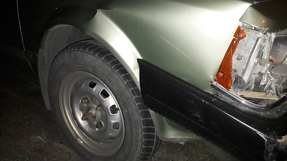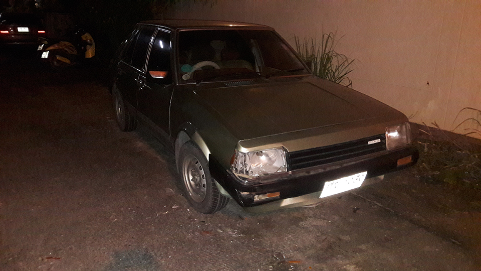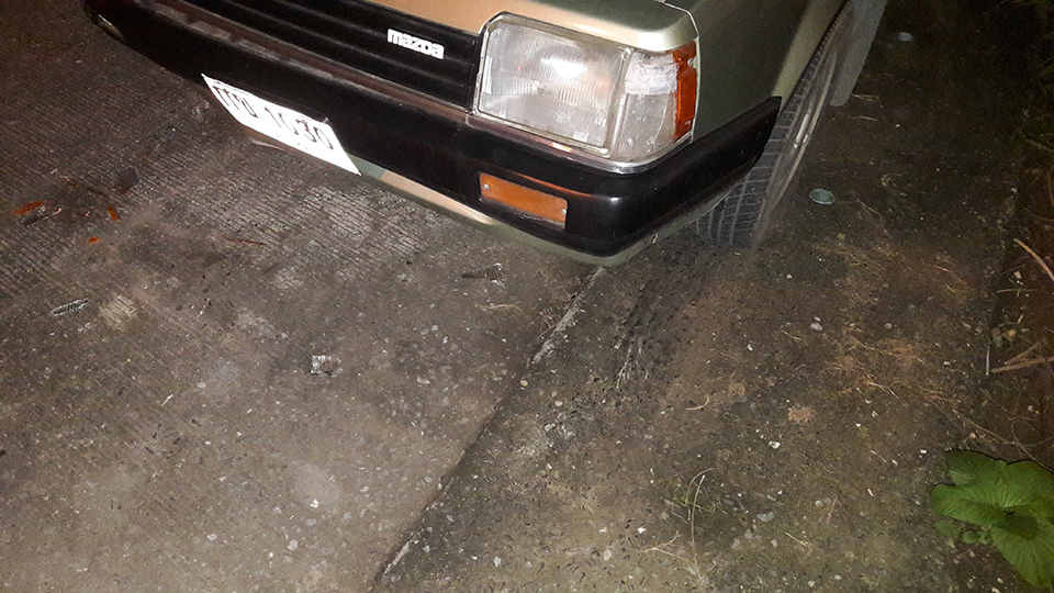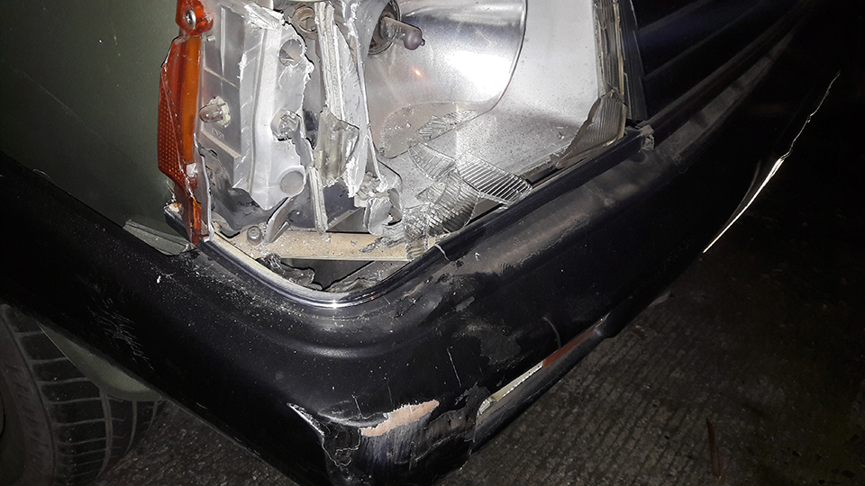 วันที่ 26 ตุลาคม 2559 เวลาประมาณ 21.00 น. ขณะที่กำลังนอนดูทีวี และเล่นมือถือกันเป็นปกติหลังจากกลับจากทานข้าวนอกบ้านมาไม่นาน มีน้องข้างๆบ้านมากดกริ่งเรียก และได้แจ้งว่ารถที่จอดไว้ในซอย (จอดประจำ) โดนชน ในใจคิดไม่น่านะจอดตรงนั้นใครจะมาพุ่งชนได้ แล้วก็บอกน้องเค้าไปว่ารถพี่ปกติไฟเลี้ยวมันก็แตกอยู่ละนะเอาเทปปิดไว้ (กำลังหาอะไหล่อยู่ เพราะรถเก่ามาก 32 ปีแล้วเลยยังหาไม่ได้ซักที) น้องเค้าเลยบอกแต่ว่ามันแตกกระจายเลยนะพี่ เลยรีบไปดู โอ้โหแม่เจ้า (ขออนุญาตภาษาท้องถิ่น) “โหวๆๆๆ ตายละข้าไผมาชนนิ แตก