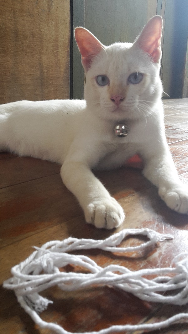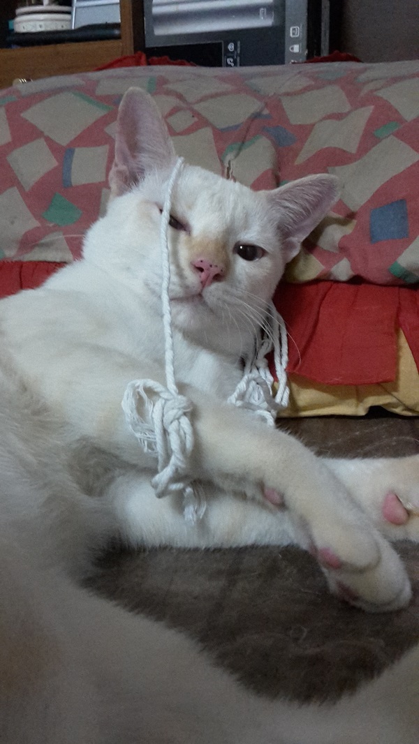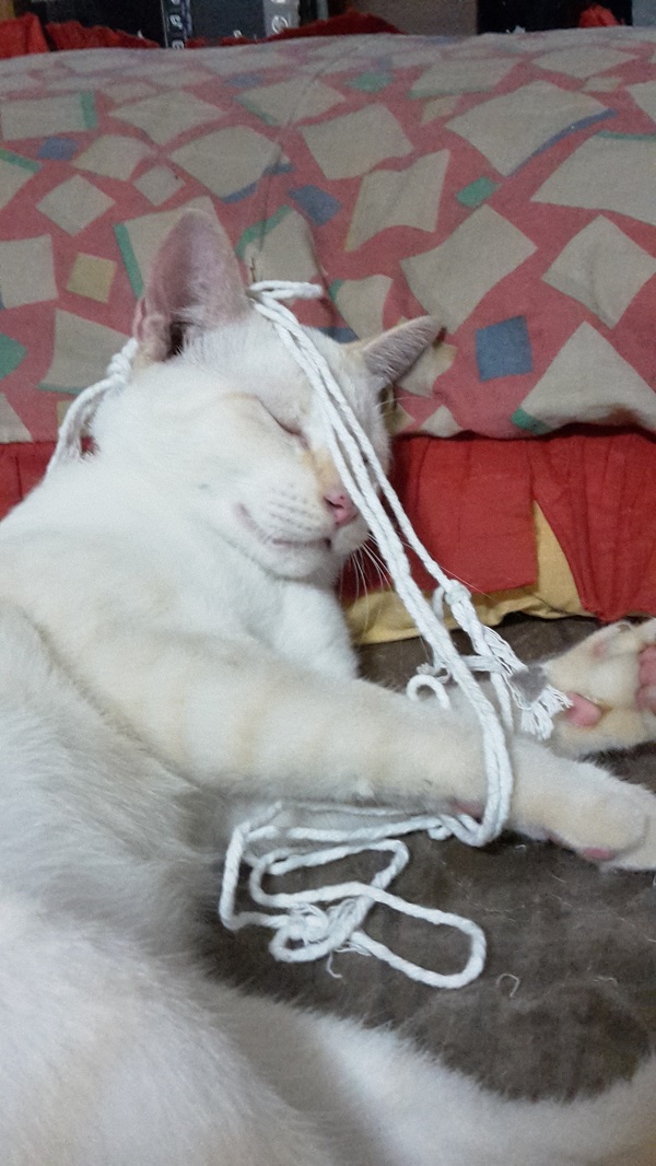 หมูมะ เป็นแมวเลี้ยงง่าย กิน แล้วก็นอน เชือกเส้นเดียว หมูมะก็เล่นได้อย่างมีความสุข