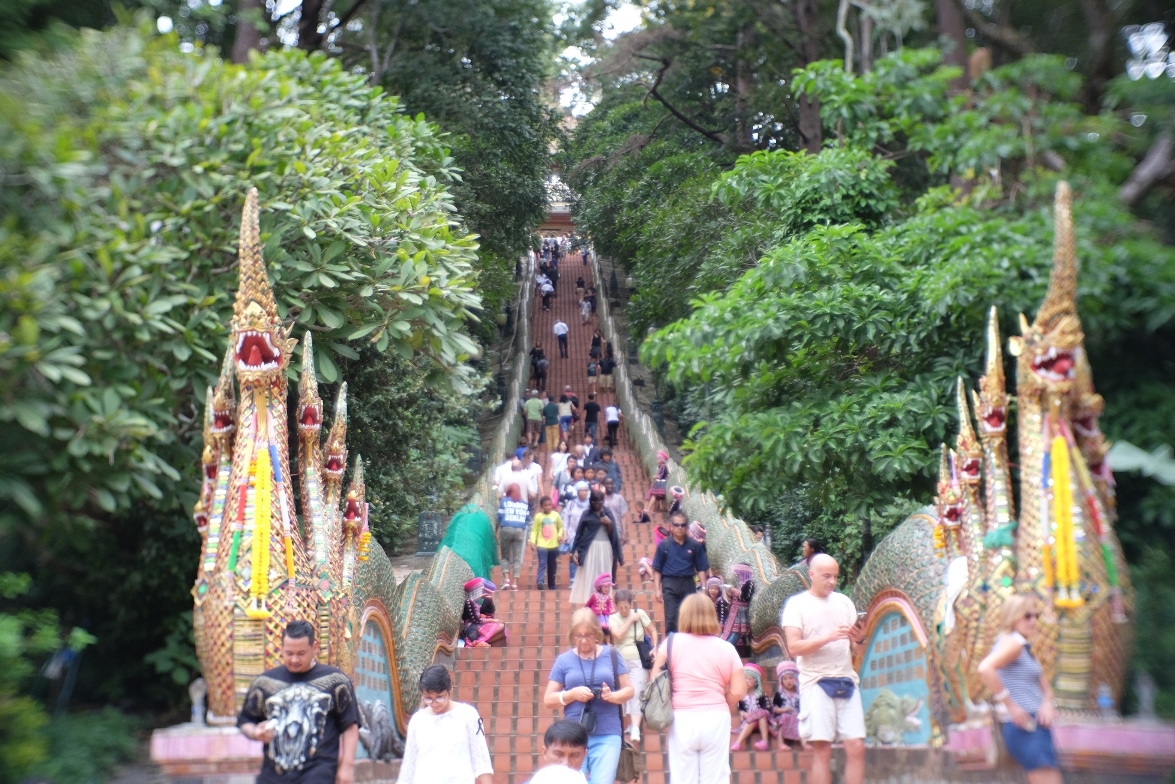 และมุ่งหน้าไปยังท่ารถขึ้นดอยสุเทพ พอถึงท่ารถ คนขับก็เสนอว่าไปทั้ง 3 ที่เลยมั้ย มีดอยสุเทพ พระตำหนักภูพิงค์ และบ้านม้งดอยปุย ในราคาไปกลับ 180 บาท/คน เออคุ้มดีว่ะ ก็ตอบกลับว่าไปค่ะ! (เพราะไปกลับแค่ดอยสุเทพก็คนละ 80 บาทแล้ว) แต่ต้องรอให้ครบ 10 คนก่อนนะ รถถึงจะออก ทีนี้จุดพีคมันอยู่ตรงนี้ค่ะ จริงๆมีต่างชาติจะไปทั้ง 3 ที่แบบเรา แต่พอถึงดอยสุเทพก็บอกว่าไม่ไปแล้วเฉยเลย จะเที่ยวแค่ตรงนี้ ความซวยดันตกอยู่ที่เราสินะ ลุงคนขับเทเราค่ะ! นางบอกไม่ไปแล้วนะ ถ้าจะไปต้องเหมาคนละ 800 บาท (แพงสุดดดดด) เรากับเพื่อนก็เลยต้องจำใจลงแค่ดอยสุเทพ ขากลับลงมาจะเจอเด็กดอยที่รอเรียกถ่ายรูปพร้อมวลีเด็ดของพวกนาง "พี่ๆ ถ่ายรูปมั้ย ยี่ฉิบๆ" แต่ขอบอกไว้ตรงนี้เลยนะจ๊ะ น้องไม่มีทางได้เงินพี่แน่นอน ไม่ใช่ว่าพี่งกนะ พี่แค่ไม่ชอบถ่ายรูปแค่นั้นเอง 55555555 แต่เด็กดอยน่ารักนะ แก้มแดงกันทุกคนเลย