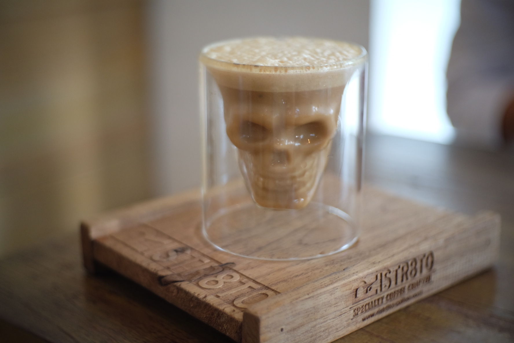 ยังค่ะ ยังไม่พอ ไปต่อกันที่ร้านที่สาม "Ristr8to Lab" จุดเด่นของร้านนี้คือแก้วรูปหัวกะโหลก เอกลักษณ์ที่ไม่เหมือนใครเลยจริงๆ แถมกาแฟก็อร่อยและหอมมากกกกก