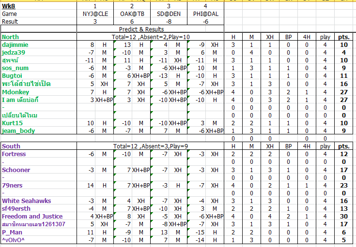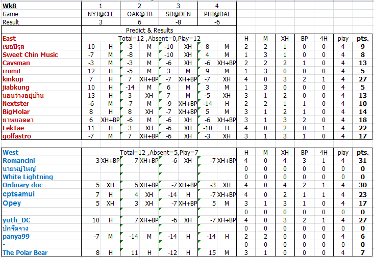 คู่ที่นำมาทายในสัปดาห์ที่1 มีดังนี้ครับ L.A.Rams @ Carolina San Francisco @ Tampa Bay Detroit @ Arizona Denver @ Oakland รูปแบบการทายผล ทายผลต่างของคะแนนระหว่าง2 ทีม + หมายถึงทายทีมเยือนชน