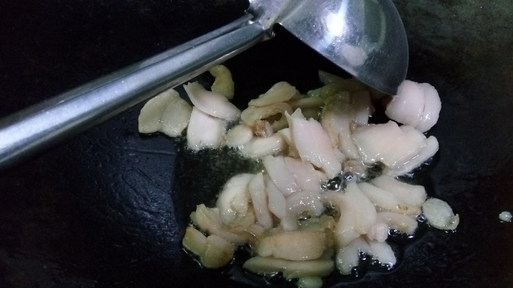 5. หรี่ไฟ แล้วตามด้วยพริกไทย แล้วก็เขย่าอีกนิดเดียว แล้วตามด้วยต้นหอมลง เร่งไฟแรง เขย่าอีกนิดหน่อย คราวนี้มันก็จะหอมเตะจมูกเลย